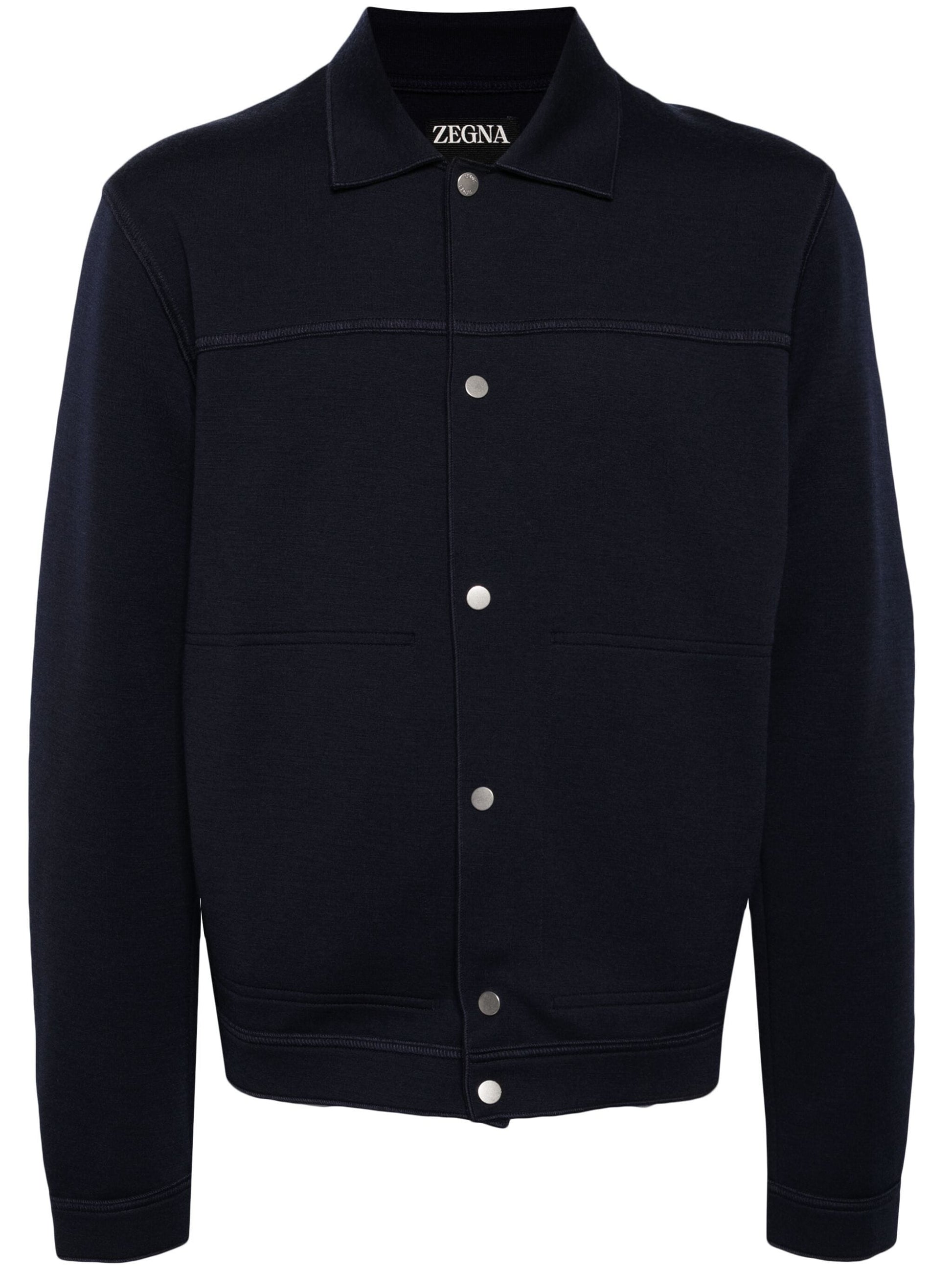 navy blue knitted construction spread collar front press-stud fastening long sleeves straight hem
