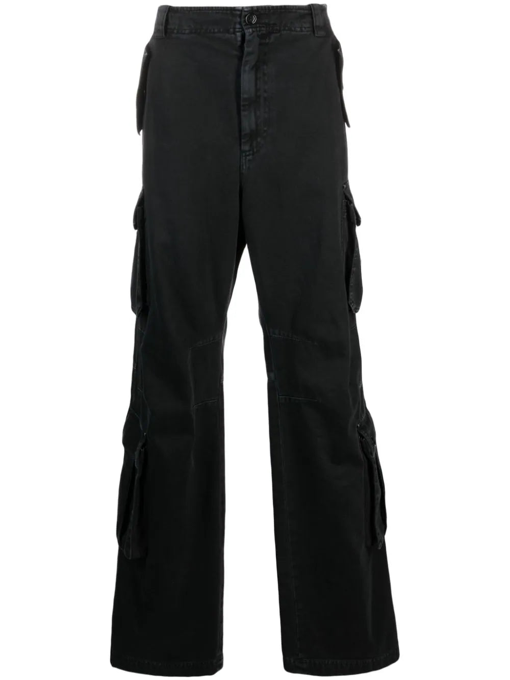 black cotton denim faded effect belt loops concealed fly and button fastening multiple cargo pockets
