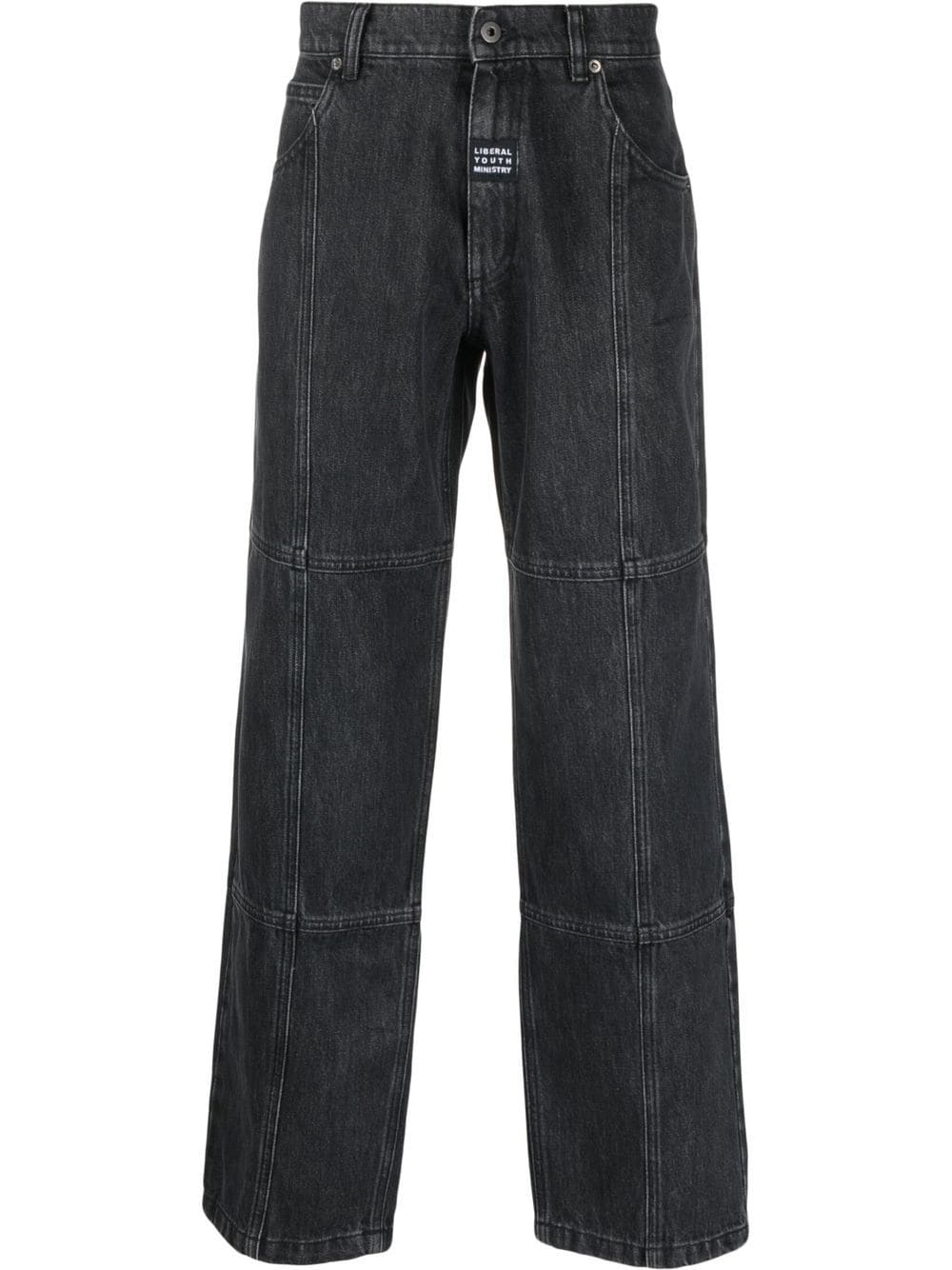 straight-leg logo-patch jeans from Liberal Youth Ministry featuring jet black, cotton, logo patch to the front, front button fastening, two diagonal pockets to the sides, two rear patch pockets and wide leg.
