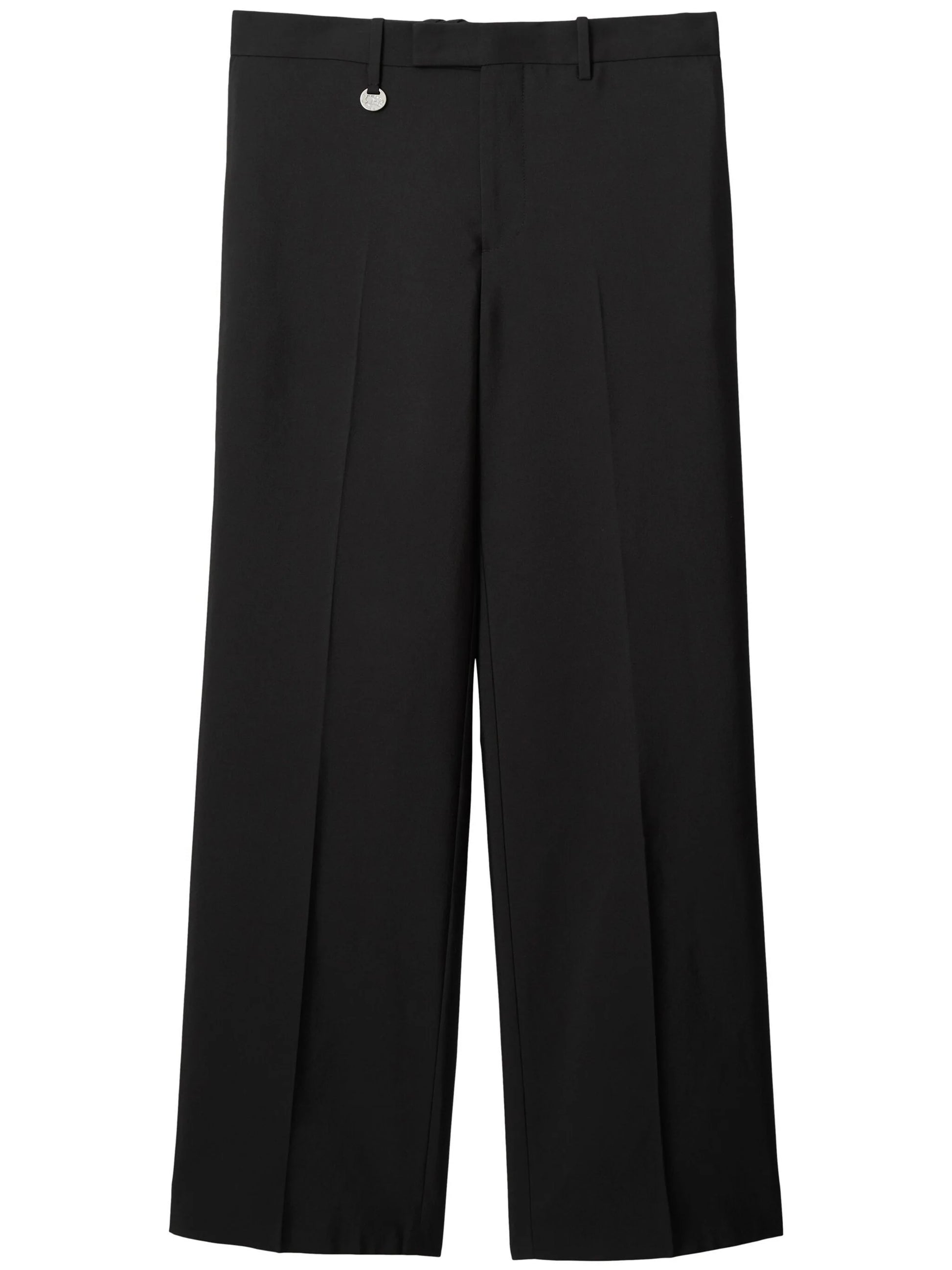 black wool blend logo charm mid-rise belt loops concealed front fastening pressed crease straight leg
