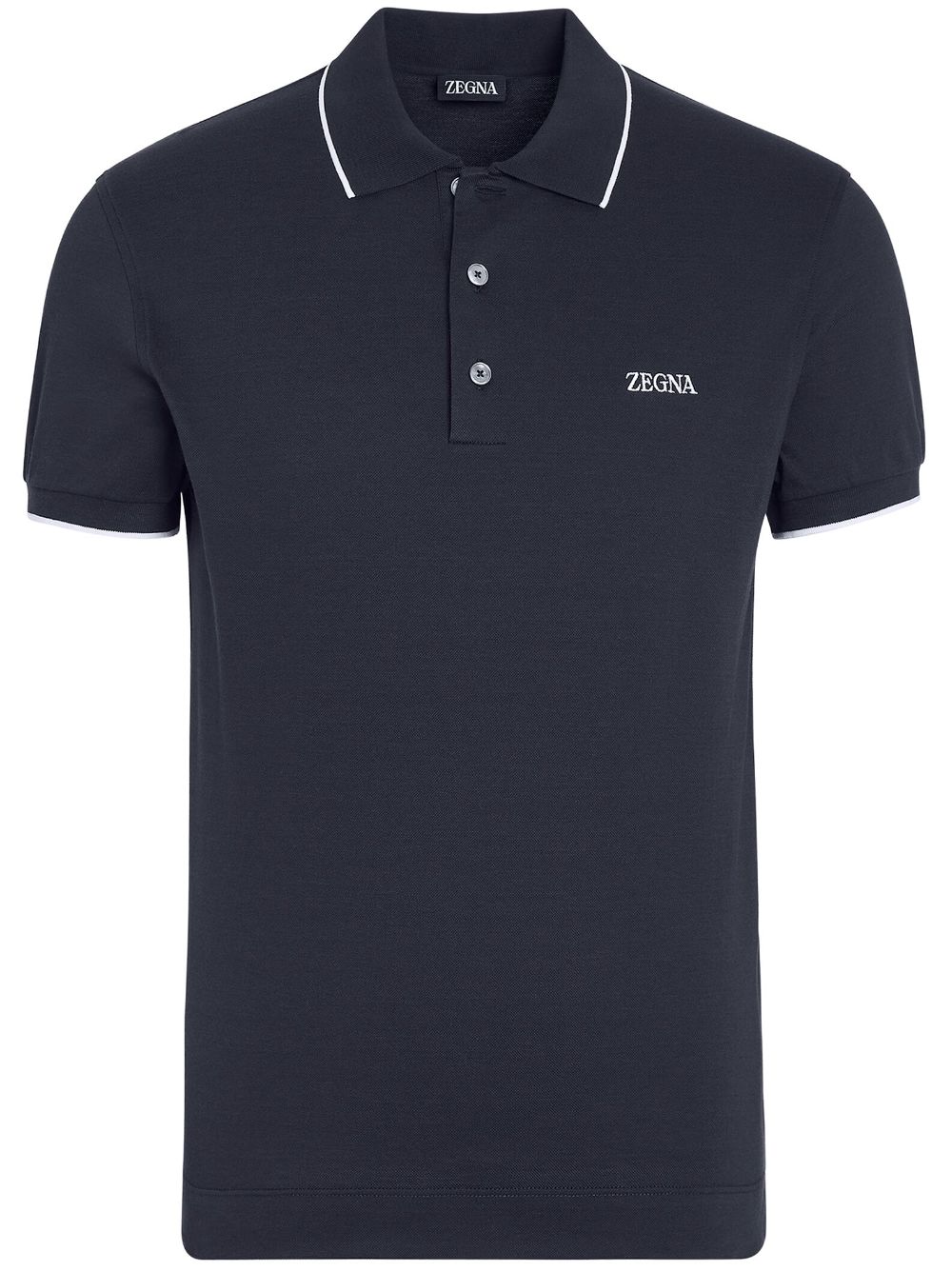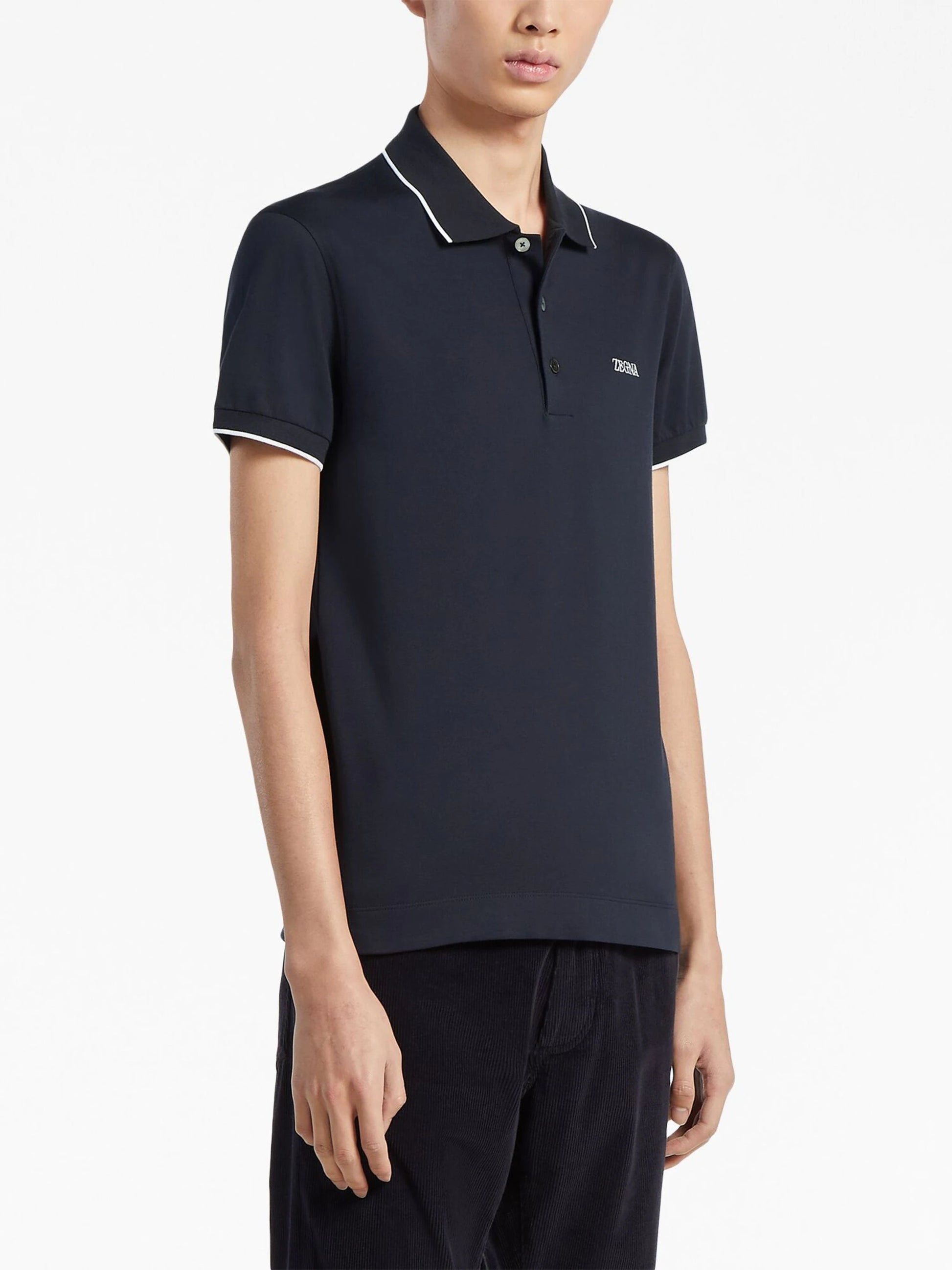 navy blue stretch-cotton embroidered logo at the chest striped edge polo collar front button placket short sleeves straight hem
