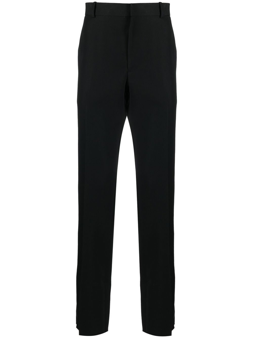 stripe-detail tailored trousers from Alexander McQueen featuring jet black, cotton-wool blend, side stripe detailing, high-waisted, belt loops, concealed front zip fastening, two side slit pockets, two rear welt pockets and straight leg.