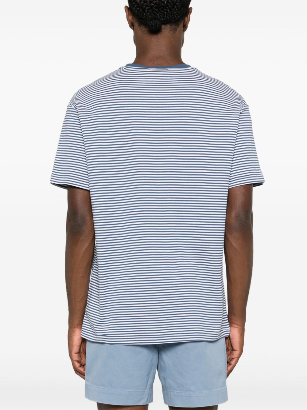 This blue and white striped cotton t-shirt in jersey texture features the signature Polo Pony embroidered logo at the chest. With a classic crew neck, short sleeves, and straight hem, it's a versatile and stylish addition to any wardrobe. Made of high-quality cotton, it offers comfort and durability.