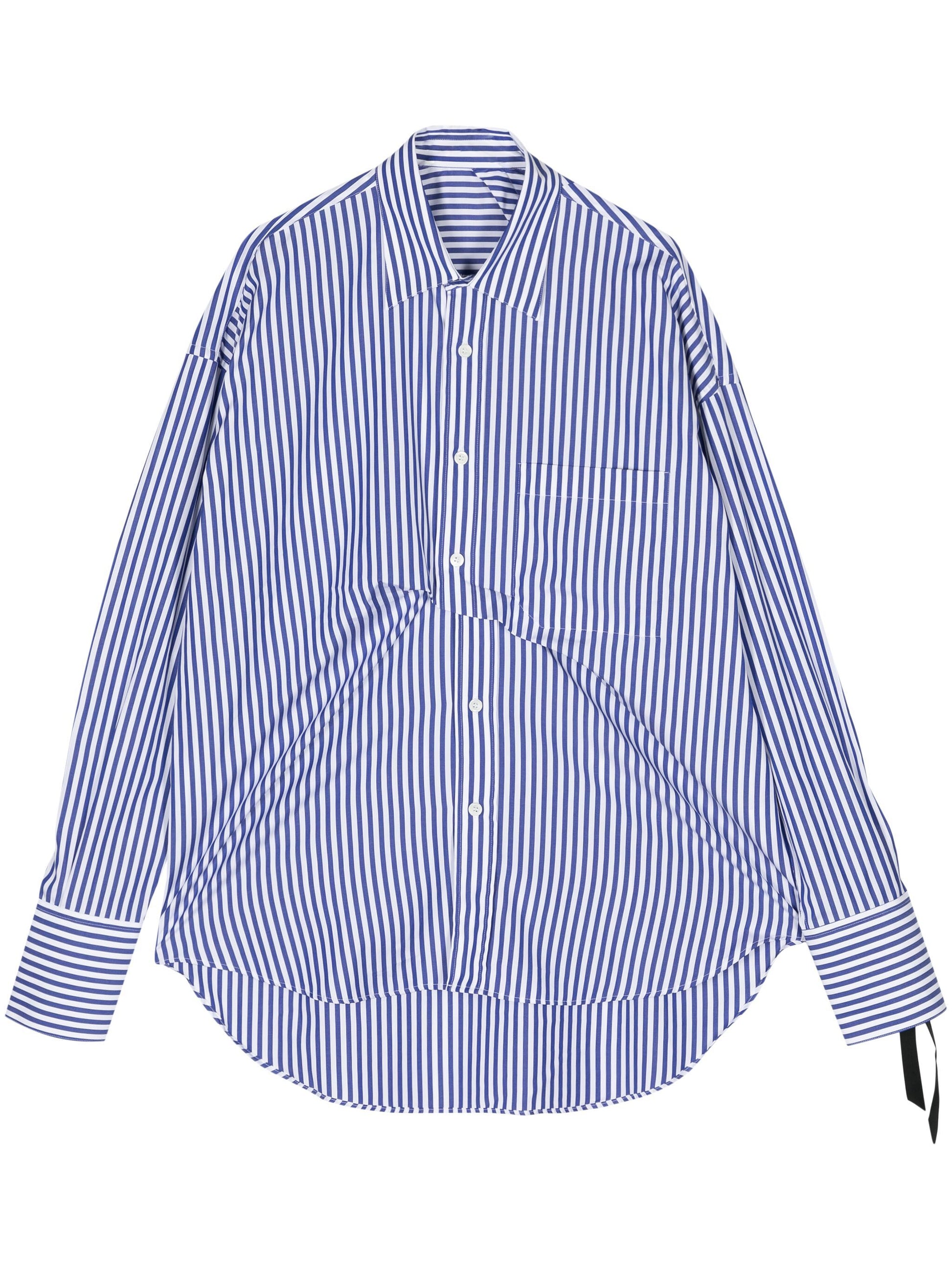 blue/white cotton vertical stripe pattern straight-point collar front button fastening long sleeves draped design curved hem