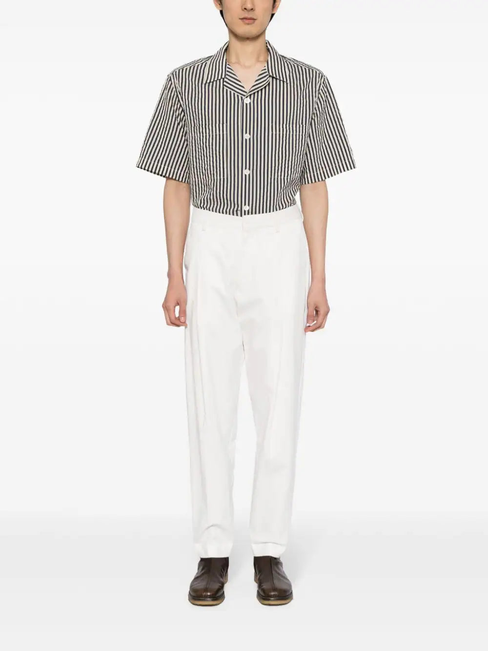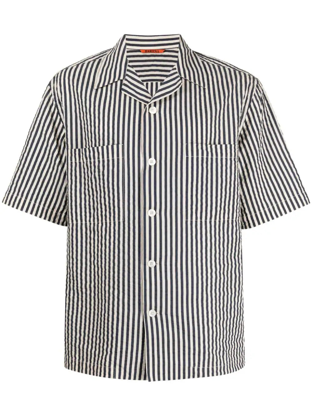 navy blue/white cotton-silk blend seersucker texture vertical stripe pattern notched collar front button fastening short sleeves two front patch pockets straight hem