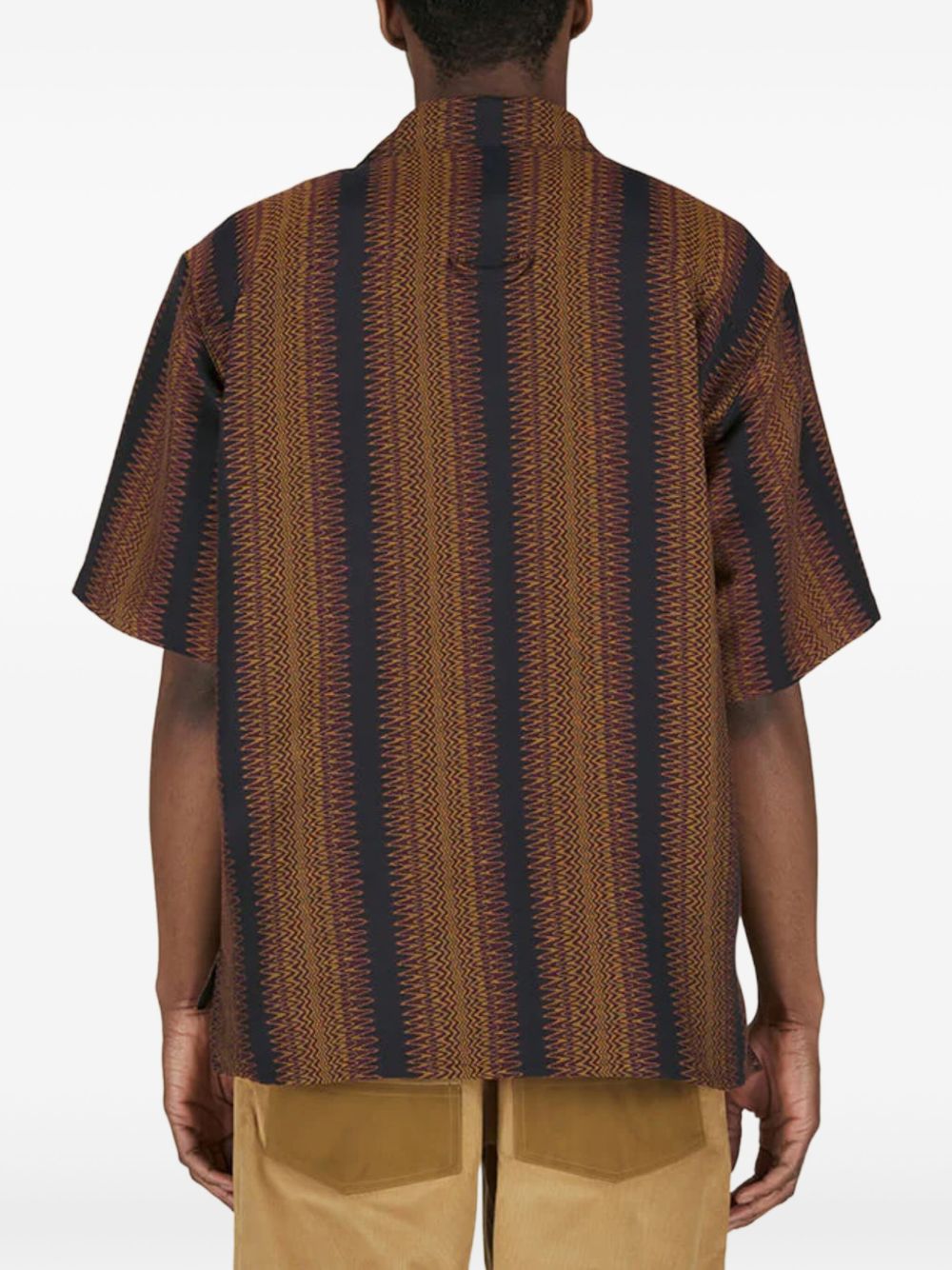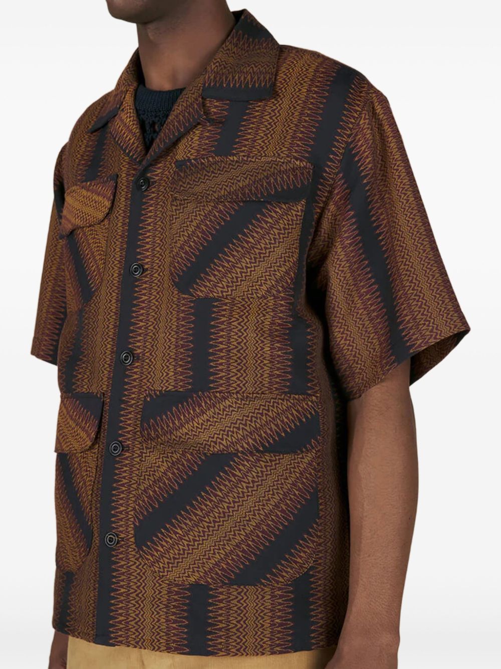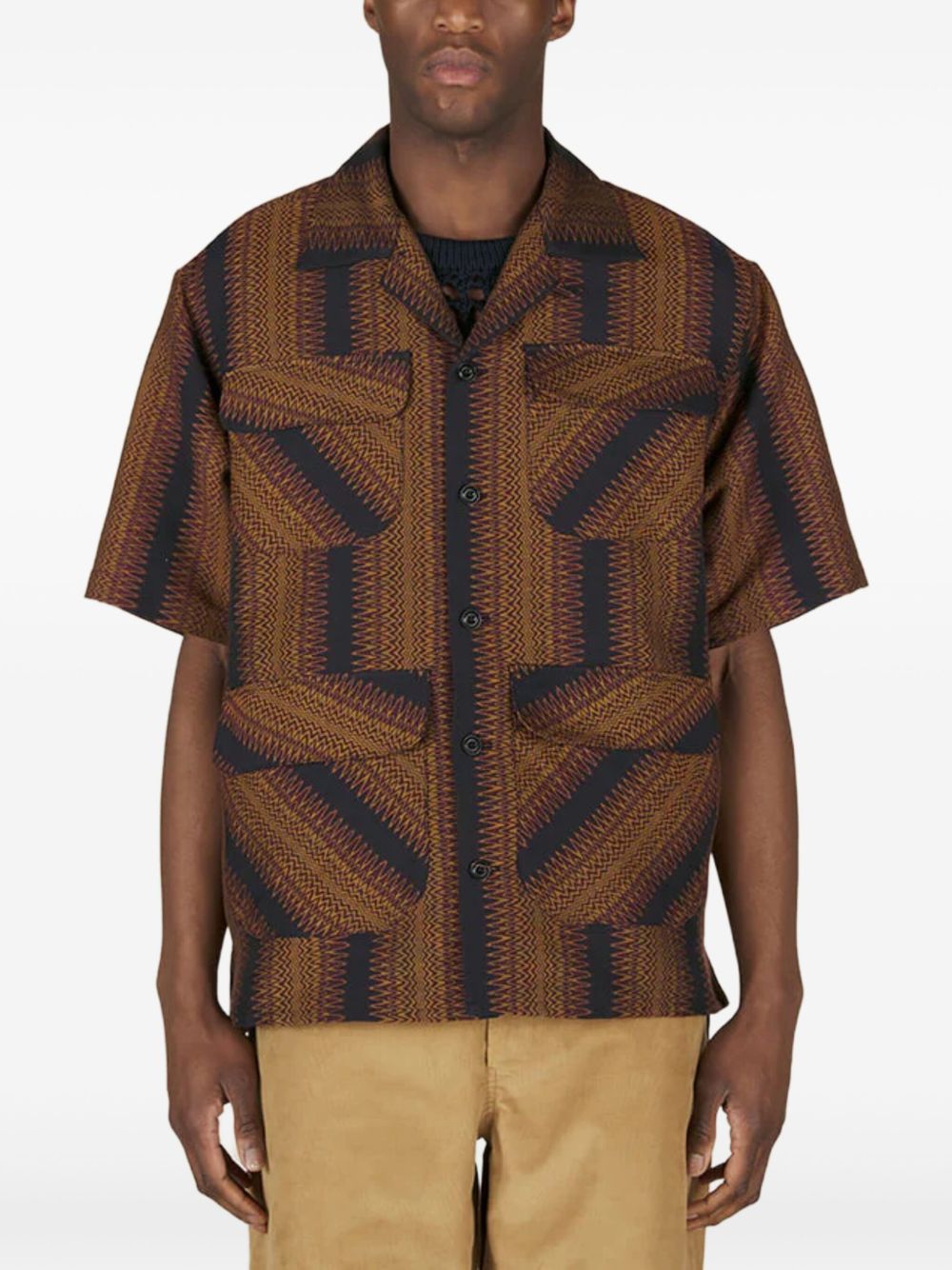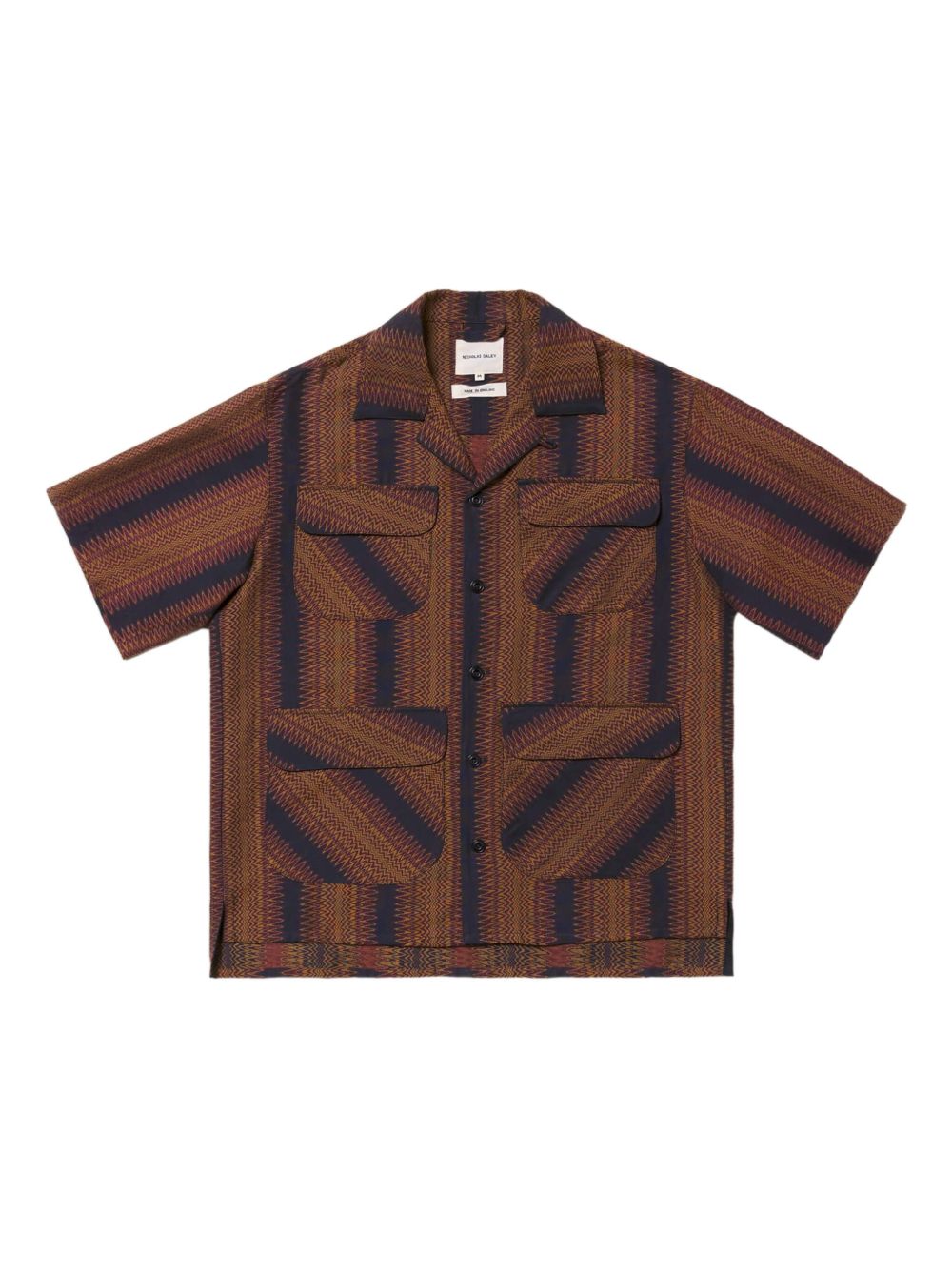 Crafted from high-quality cotton and featuring a unique geometric-pattern print, our Striped Shirt is the perfect blend of style and functionality. With a coffee brown front button fastening and four front flap pockets, it offers both convenience and a touch of sophisticated elegance. The camp collar adds a modern twist, making it a versatile addition to any wardrobe.