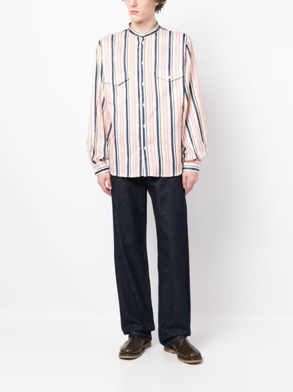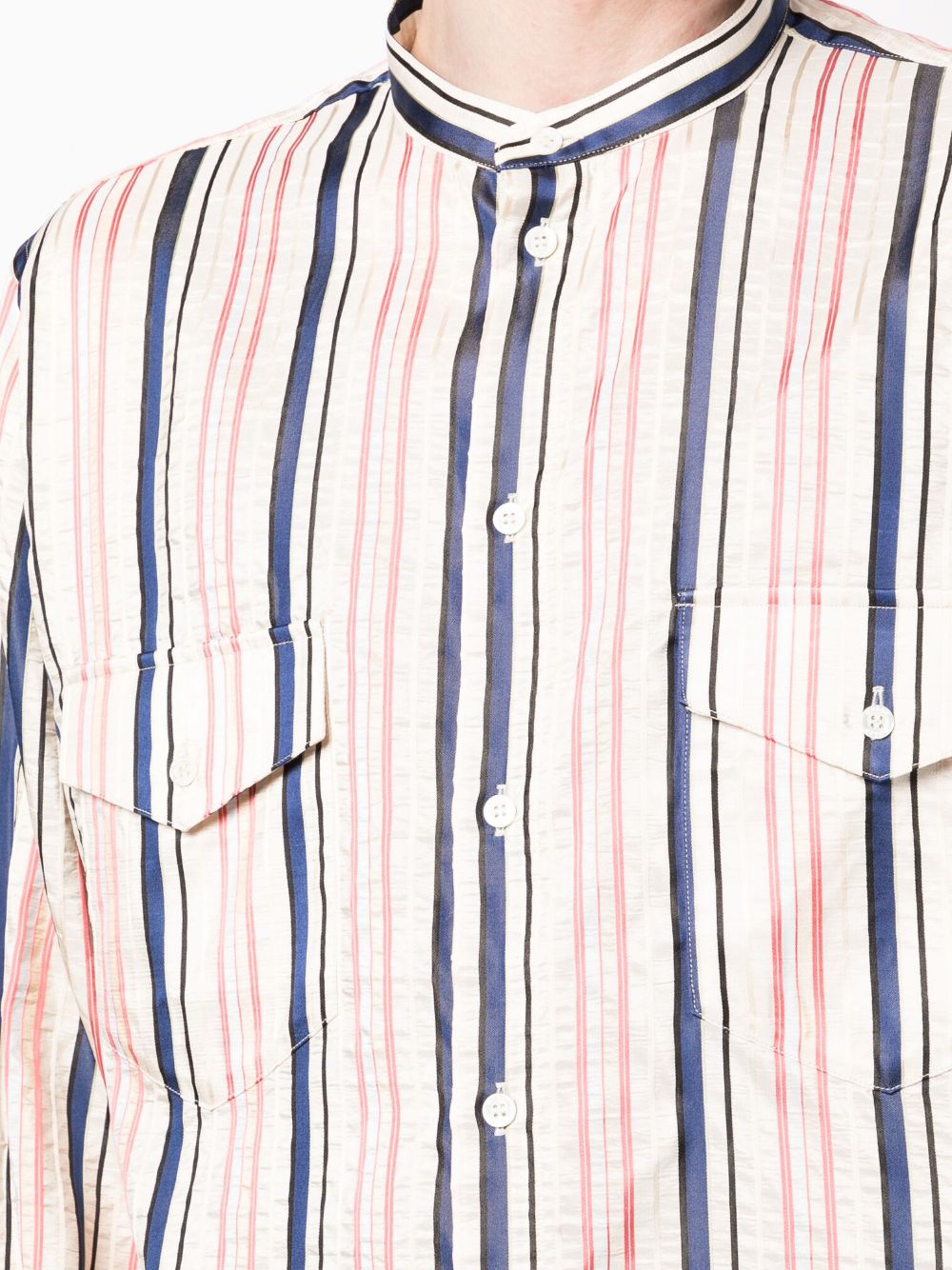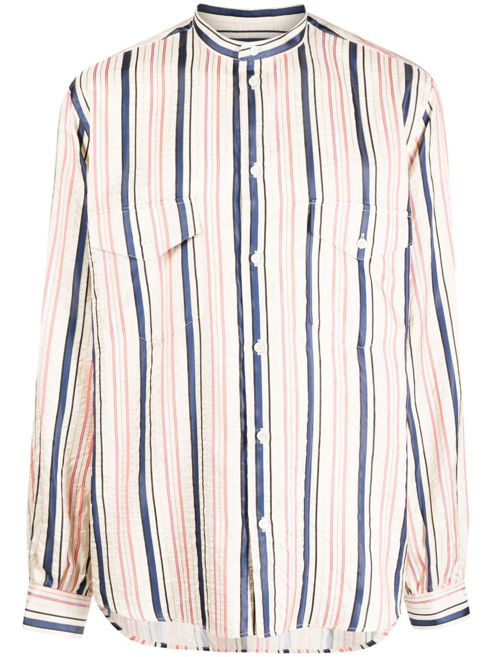 stripes-print silk shirt from BALLY featuring sand beige, navy blue, light red, vertical stripe print, band collar, front button fastening, two chest flap pockets, long sleeves, buttoned cuffs, straight hem and silk.
