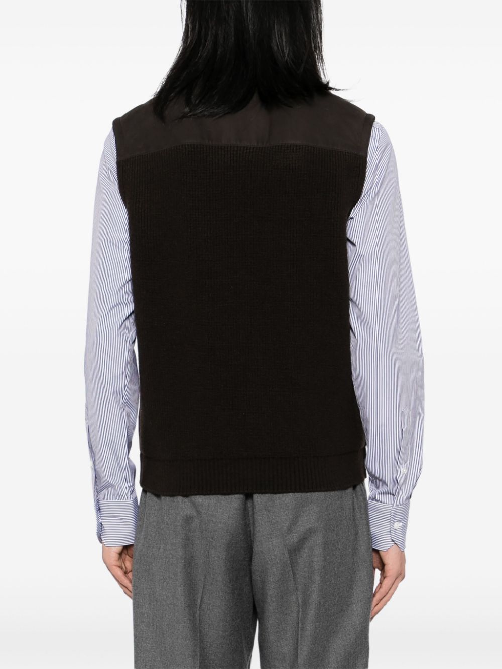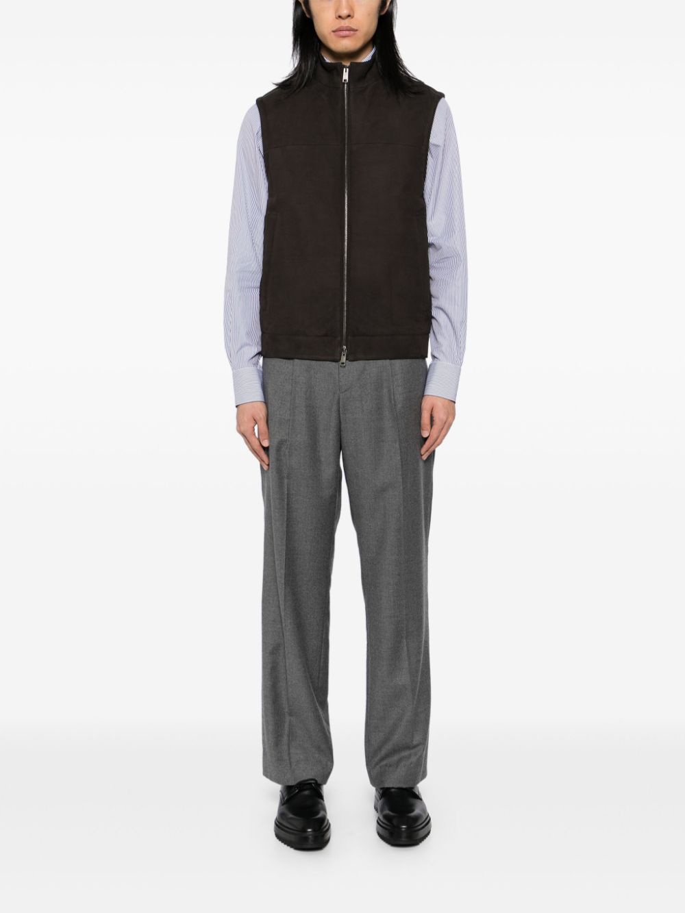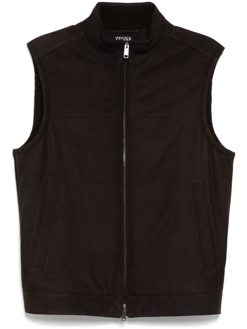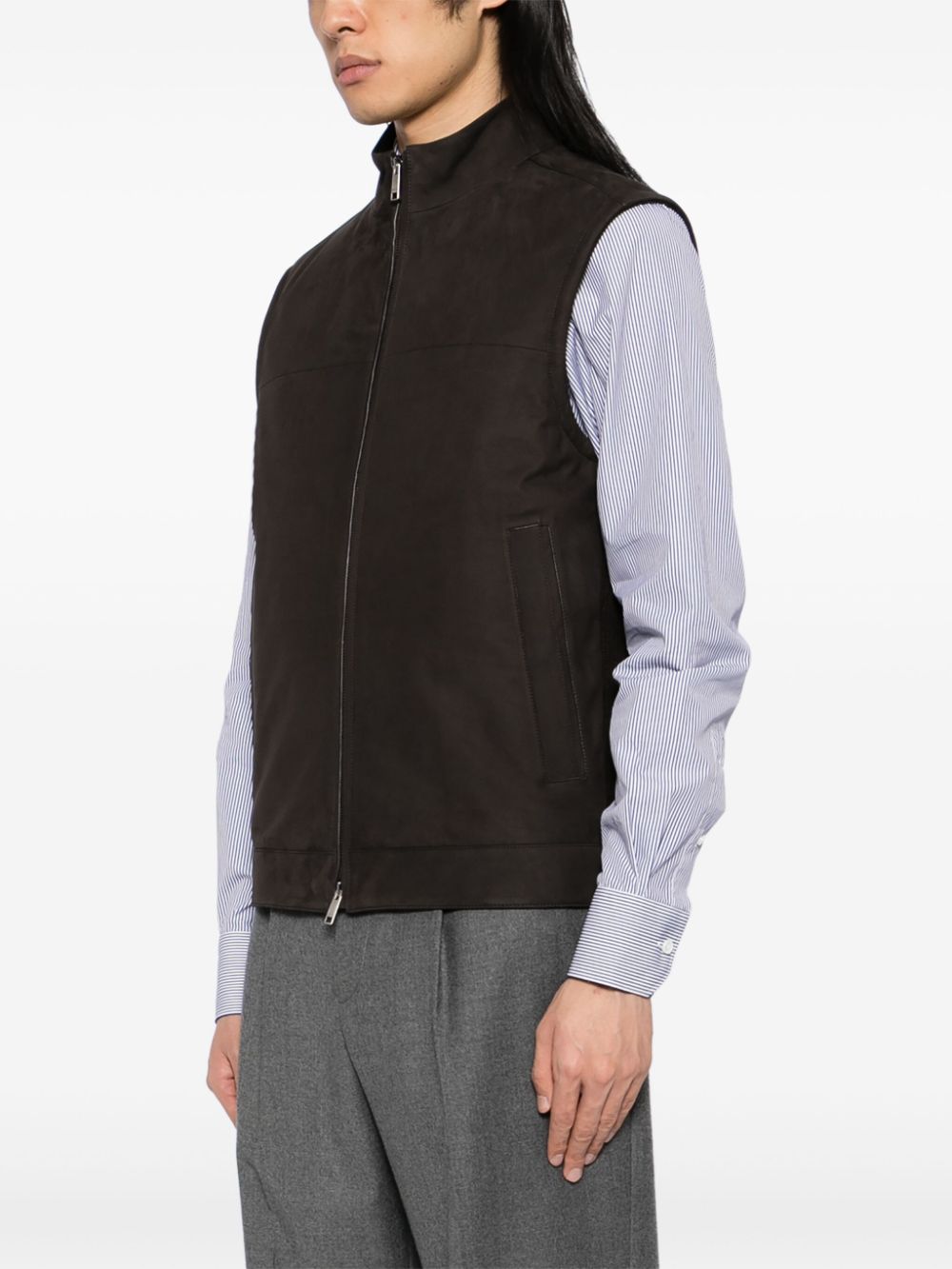 The brown suede vest boasts a two-way zip fastening and a stand-up collar for a secure and stylish fit. Its sleeveless design allows for easy layering, while the two side slash pockets provide convenient storage. Expertly crafted for comfort, versatility, and effortless style.