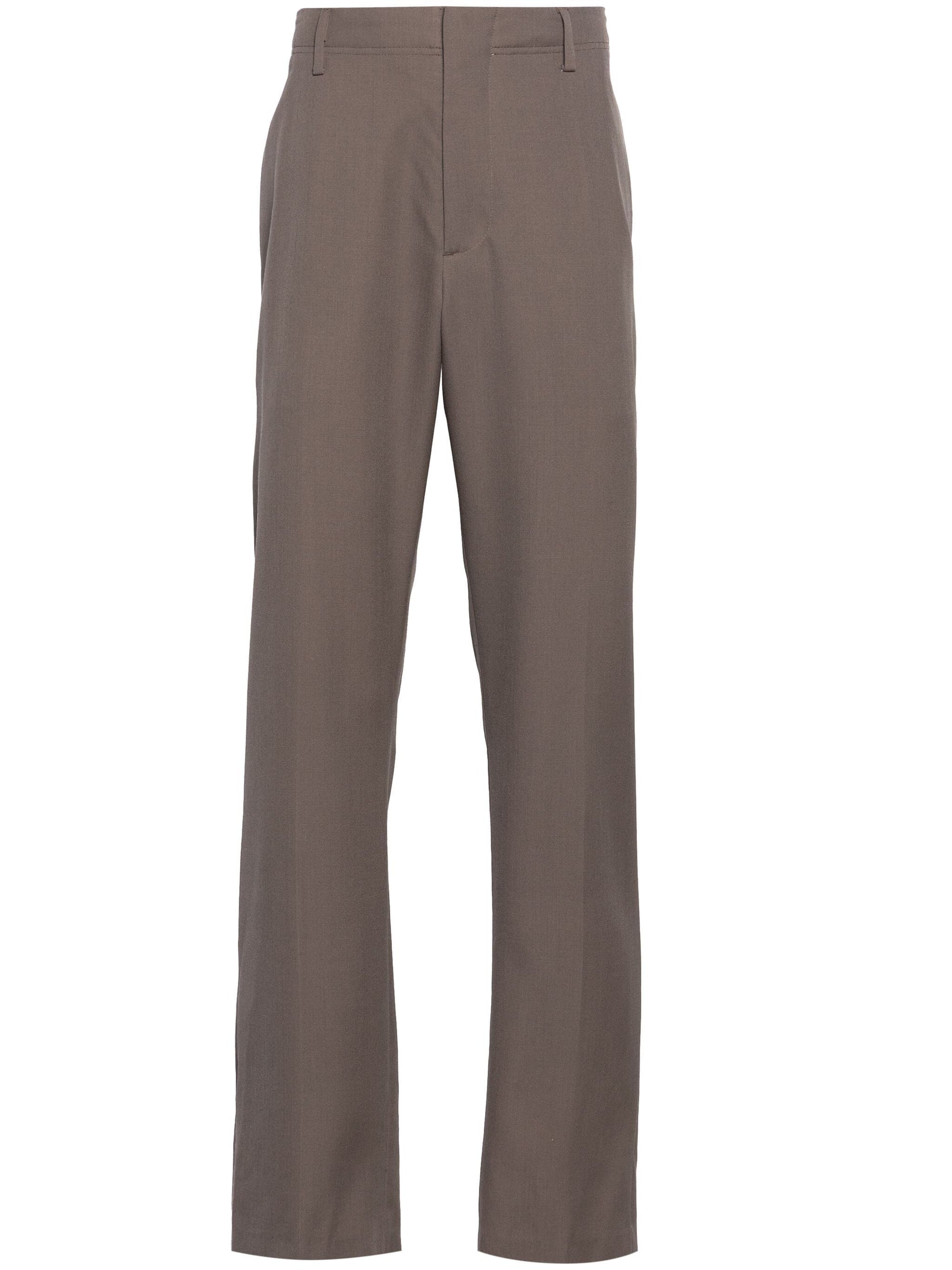 taupe grey wool twill weave belt loops pressed crease concealed front button, hook and zip fastening straight leg two side slit pockets two rear welt pockets