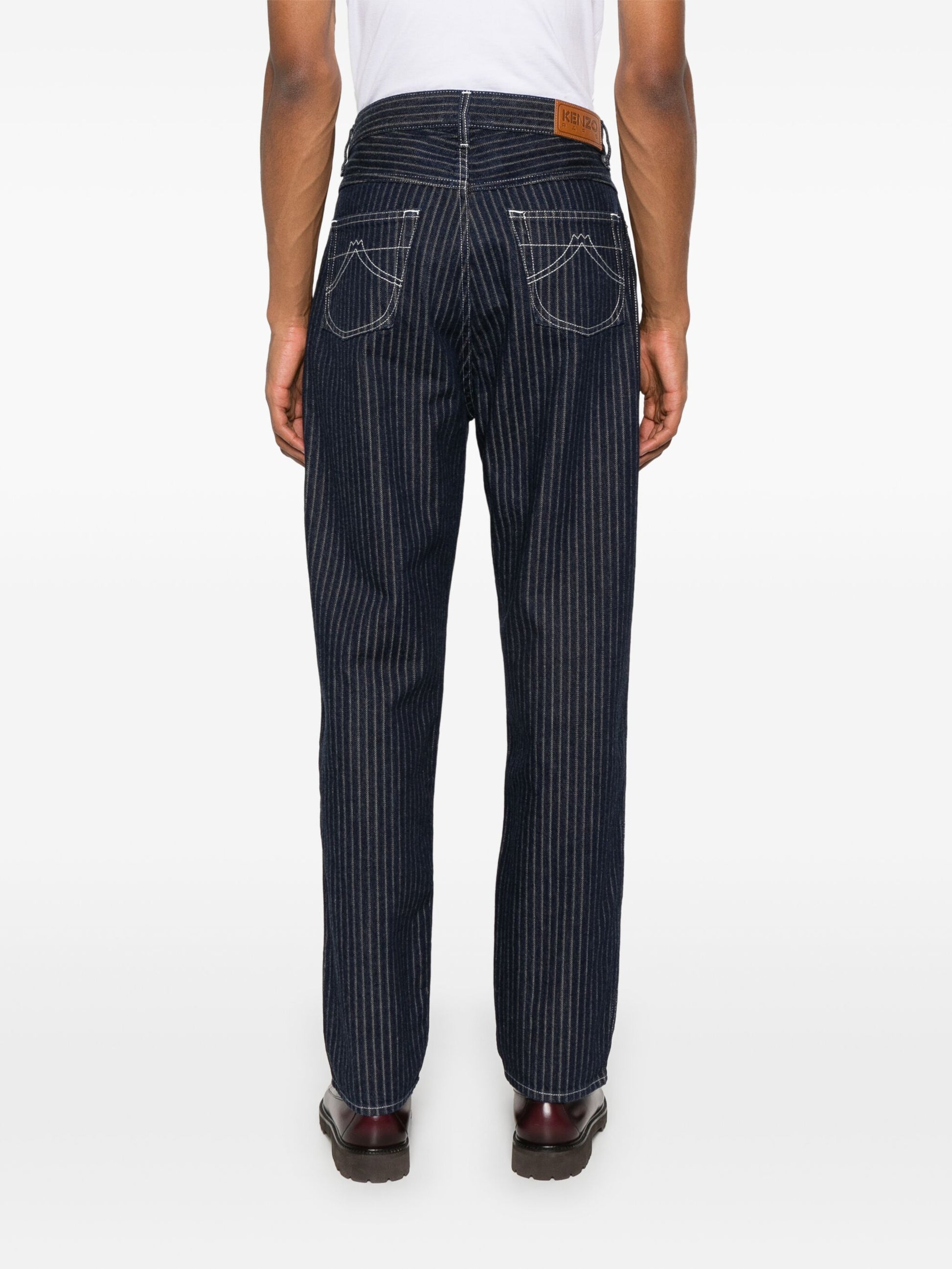 These navy blue cotton denim jeans feature a washed finish and a pinstripe pattern, along with a logo patch located at the rear belt loops. The tapered leg design is completed with a concealed front button fastening and classic five pockets, including stitched pockets for added style and functionality.