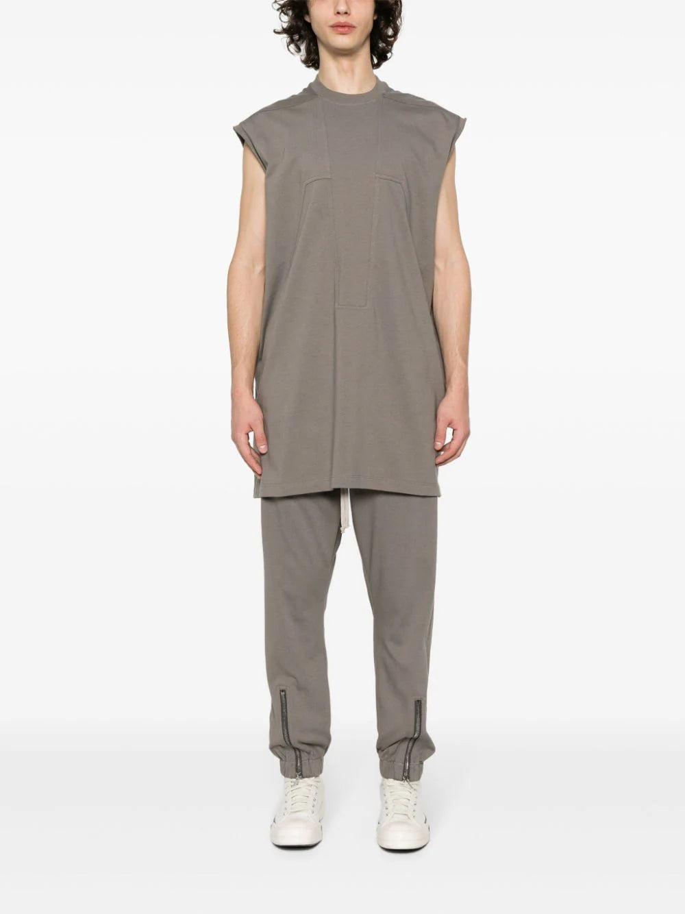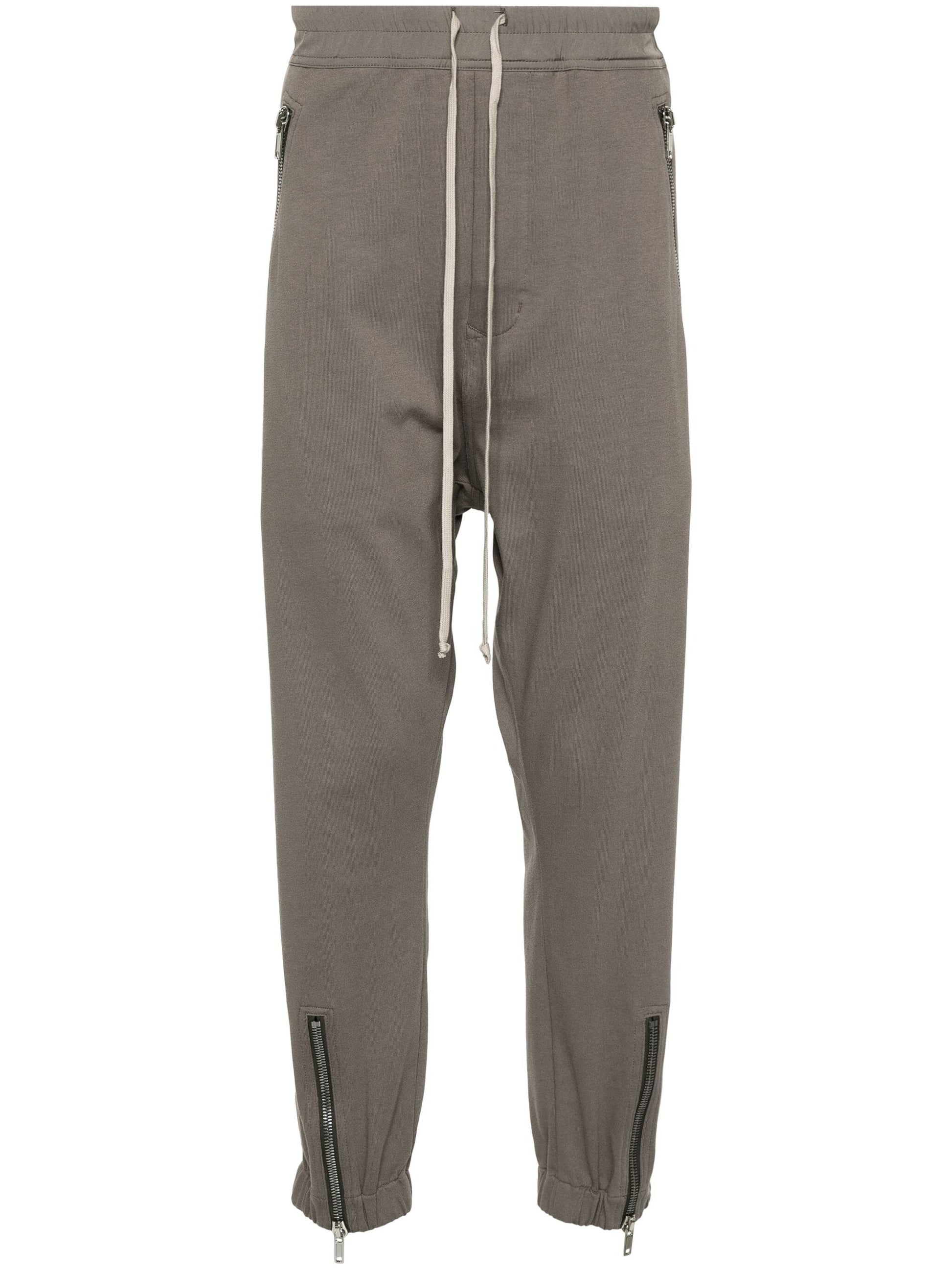 taupe grey organic cotton jersey texture front two-way zip fastening drop crotch ankle zips elasticated ankles two rear welt pockets tapered leg elasticated drawstring waistband