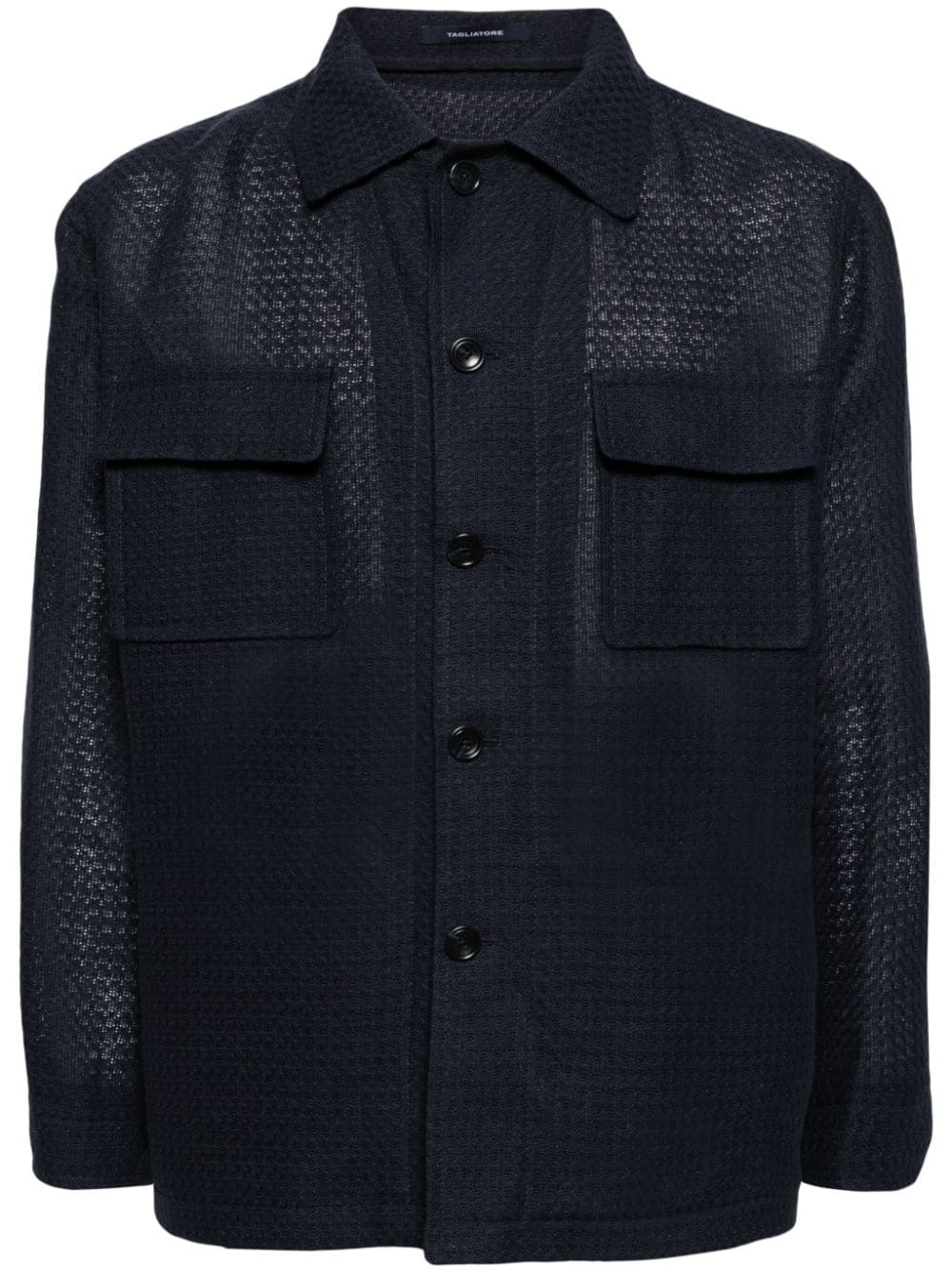 navy blue textured finish spread collar front button fastening chest flap pockets long sleeves buttoned-cuff sleeves straight hem