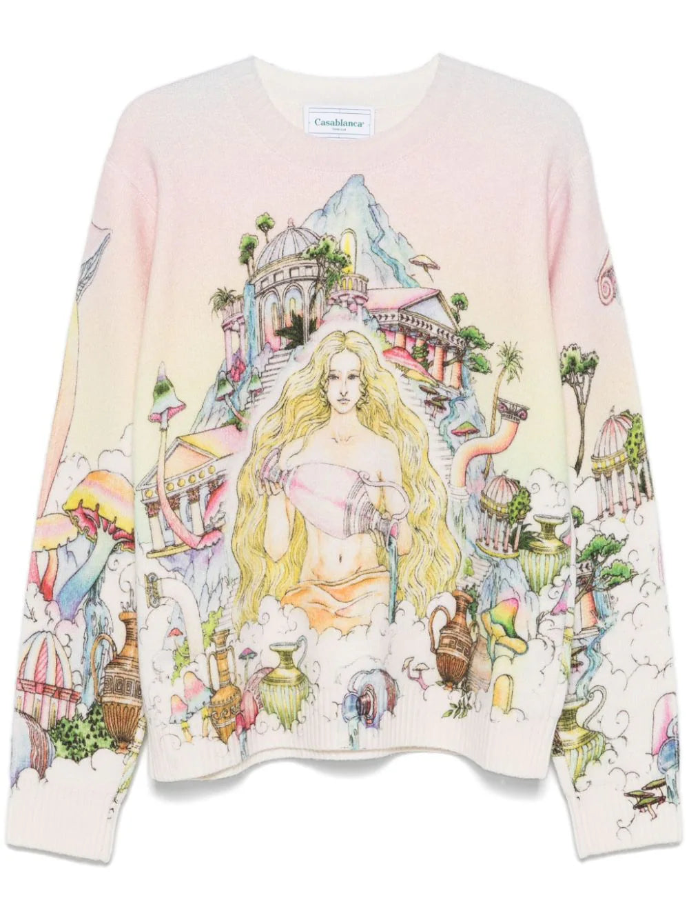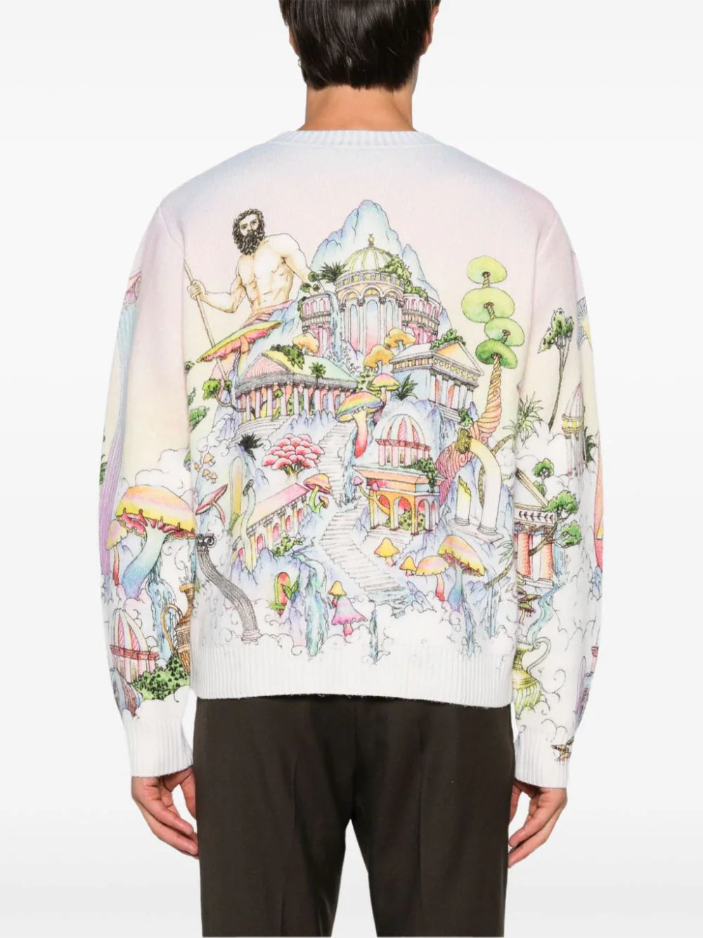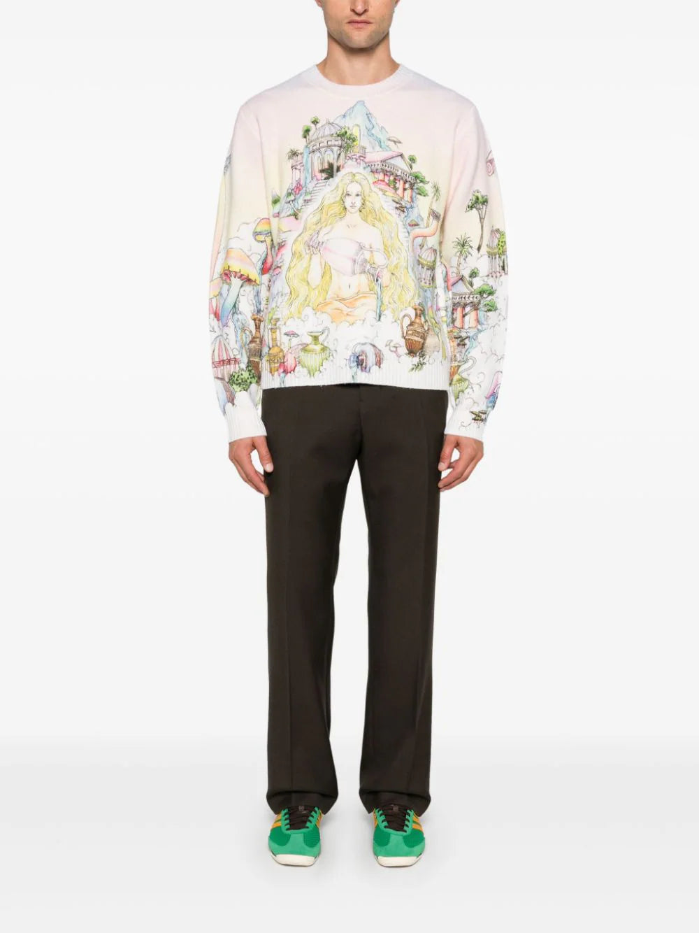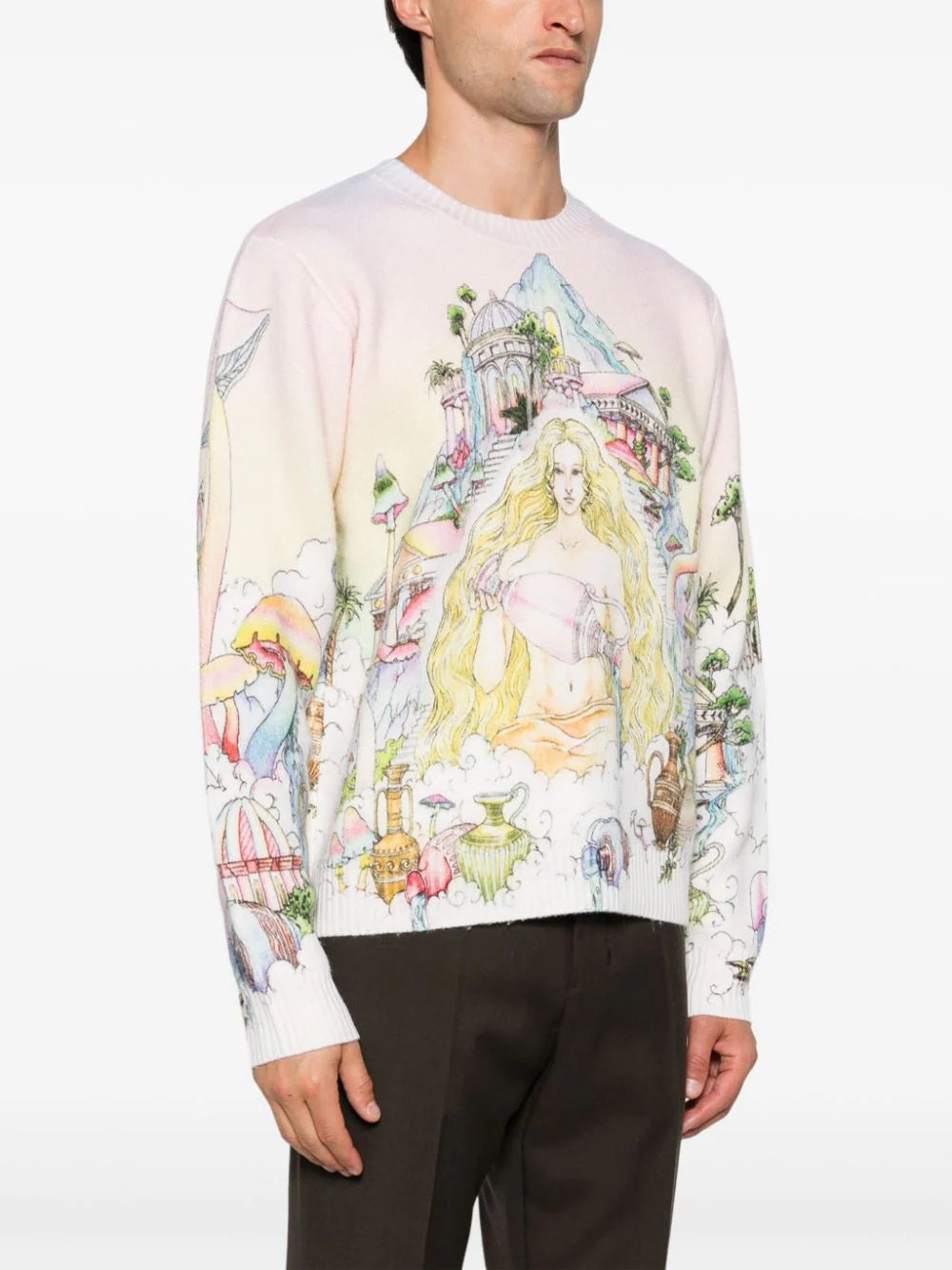 beige multicolour wool-cashmere blend fine knit The Road to Knowledge print ribbed trim crew neck long sleeves ribbed hem