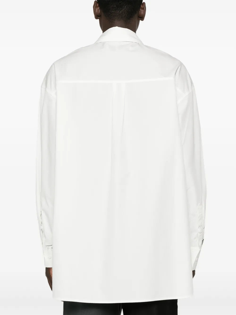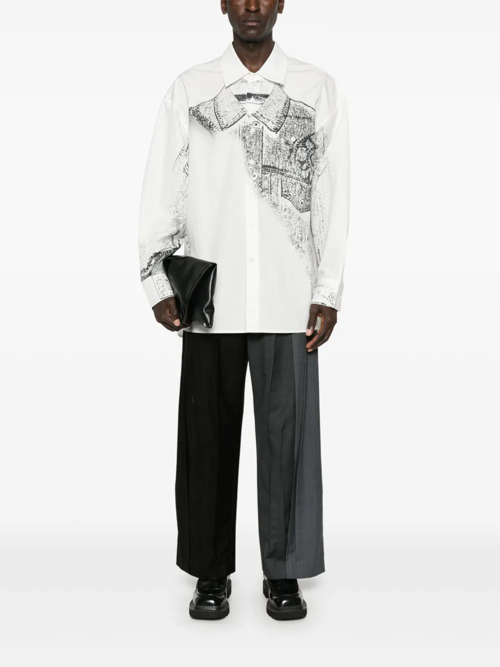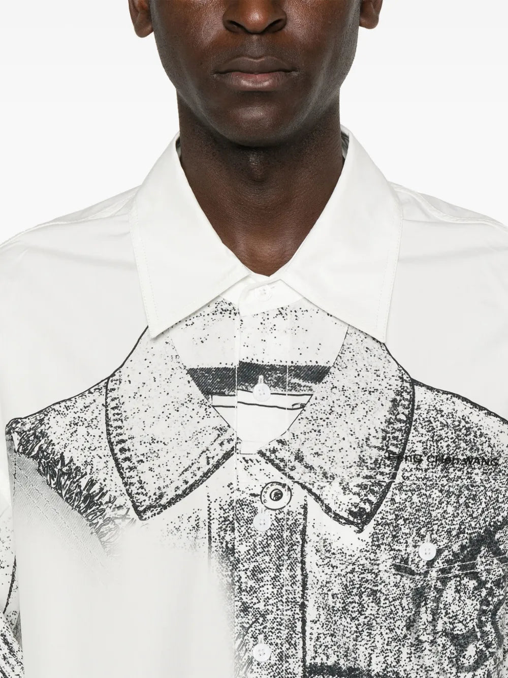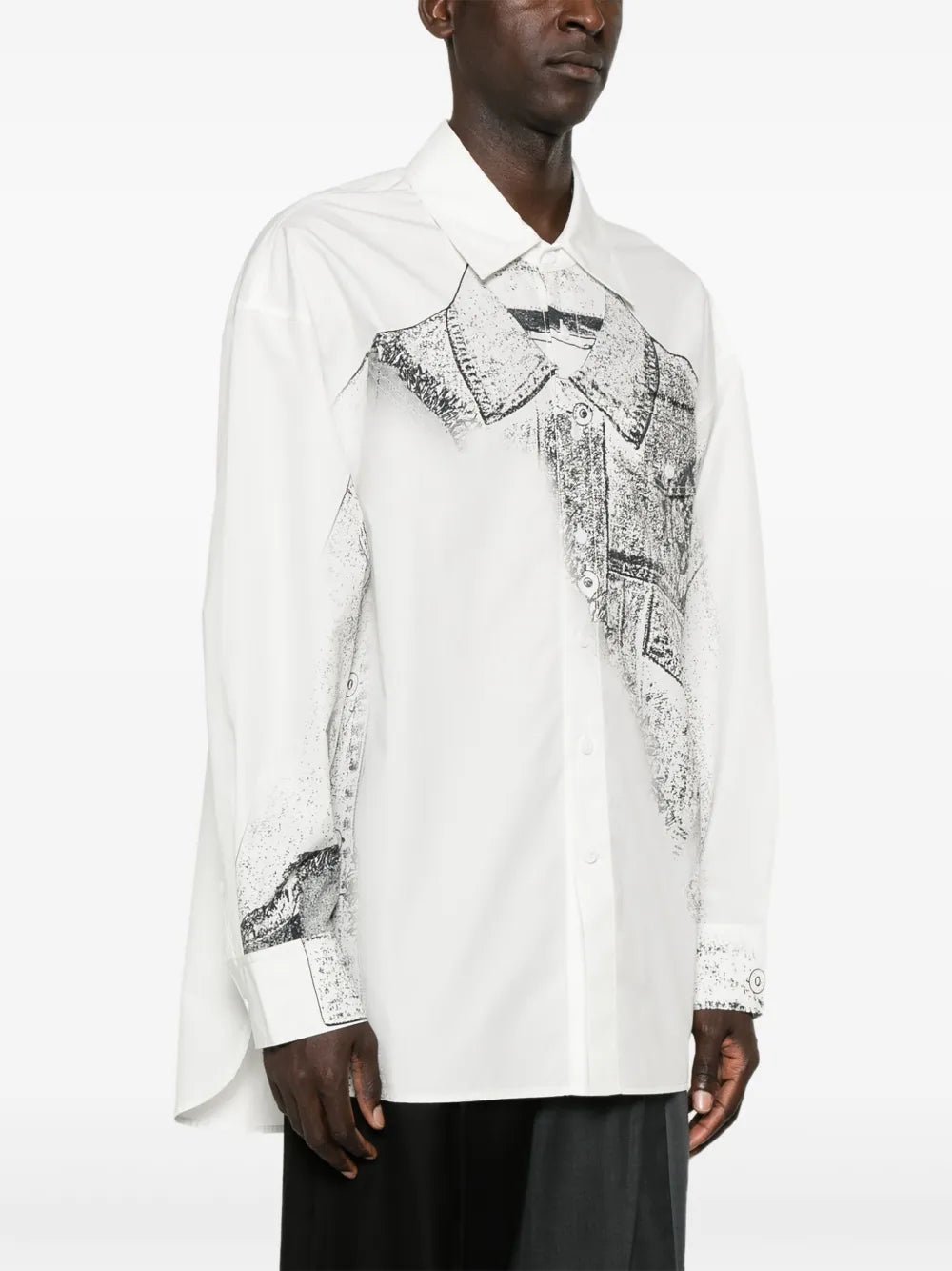 Expertly blending classic and contemporary styles, our Trompe L'oeil-Print Shirt is a must-have for any wardrobe. Made from soft and breathable white cotton poplin, it features a unique trompe l'oeil print and an embroidered logo on the chest. The drop shoulder, box-pleat detail, and high-low hem add a modern twist to this timeless piece. Perfect for any occasion with its front button fastening and classic collar.