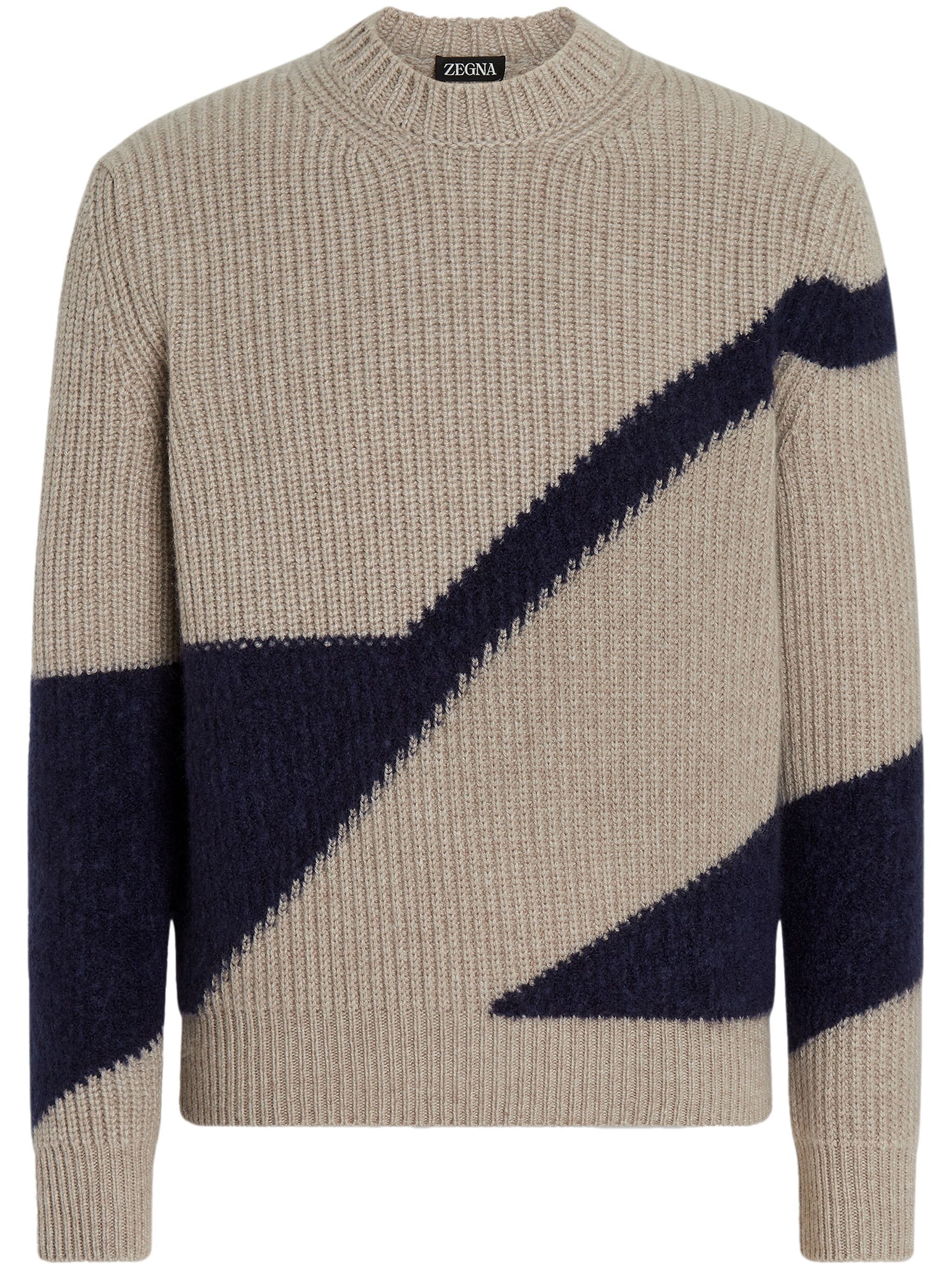 Crafted from a luxurious blend of cashmere and silk, this Two-Tone Jumper features a unique contrasting taupe brown and navy blue ribbed knit design. The slip-on style and crew neck make it easy to wear, while the geometric-pattern print adds a touch of modern sophistication. Perfect for cooler weather, this jumper offers both style and comfort.