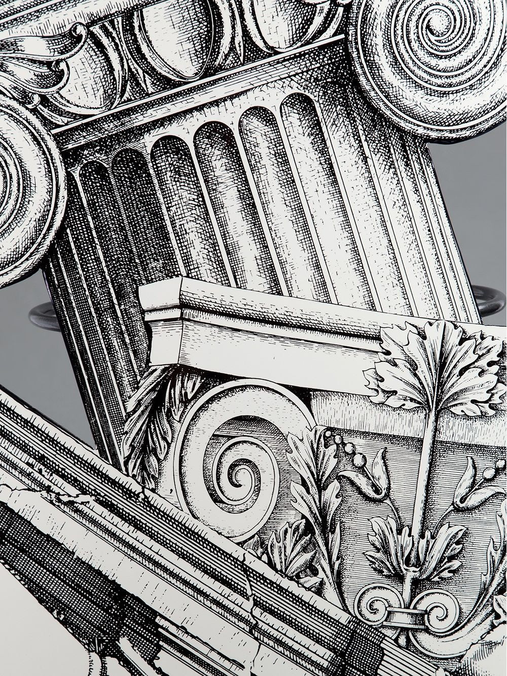 This unique umbrella stand from Fornasetti features a printed Graeco-Roman pillar design at the front, adding a touch of classical elegance to your space. The storage section at the rear keeps your umbrella organized and easily accessible. Perfect for any home or office.