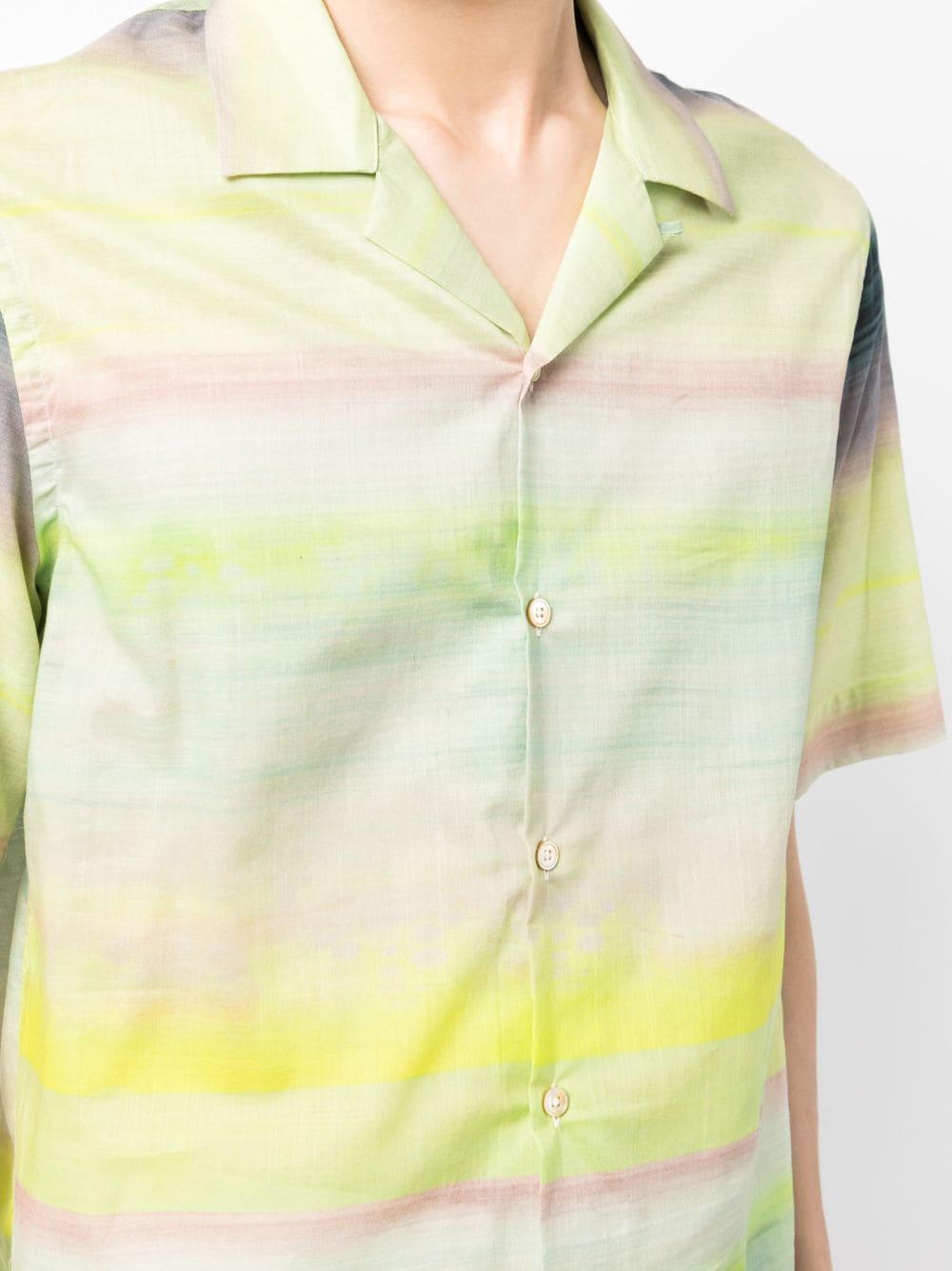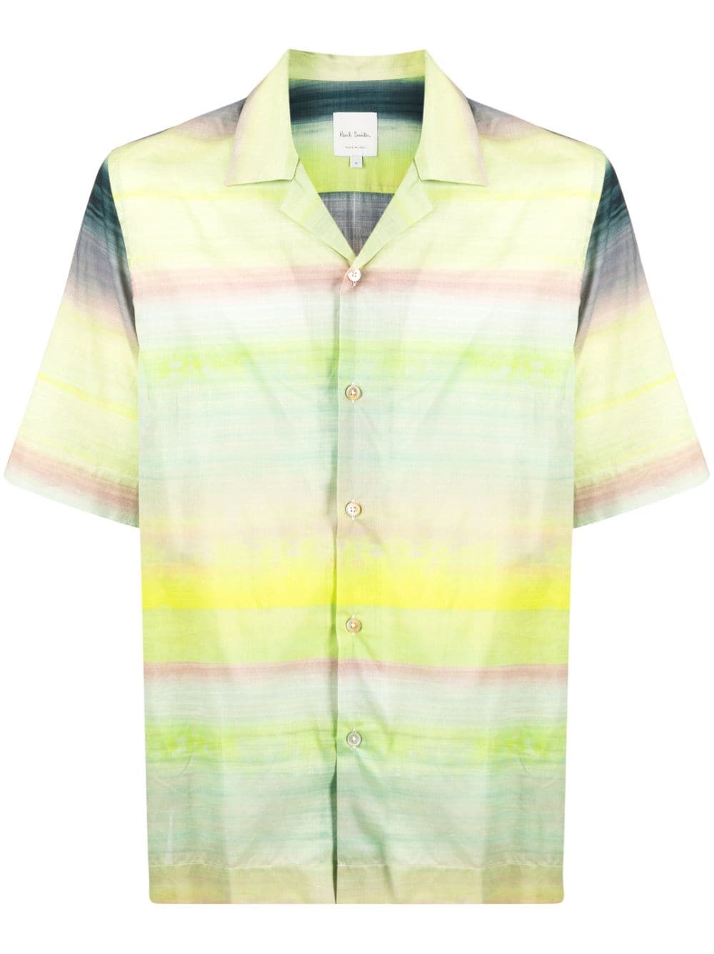 'Untitled Stripe' short-sleeve shirt from Paul Smith featuring green, cotton, horizontal stripe pattern, notched collar, short sleeves, front button fastening and straight hem.