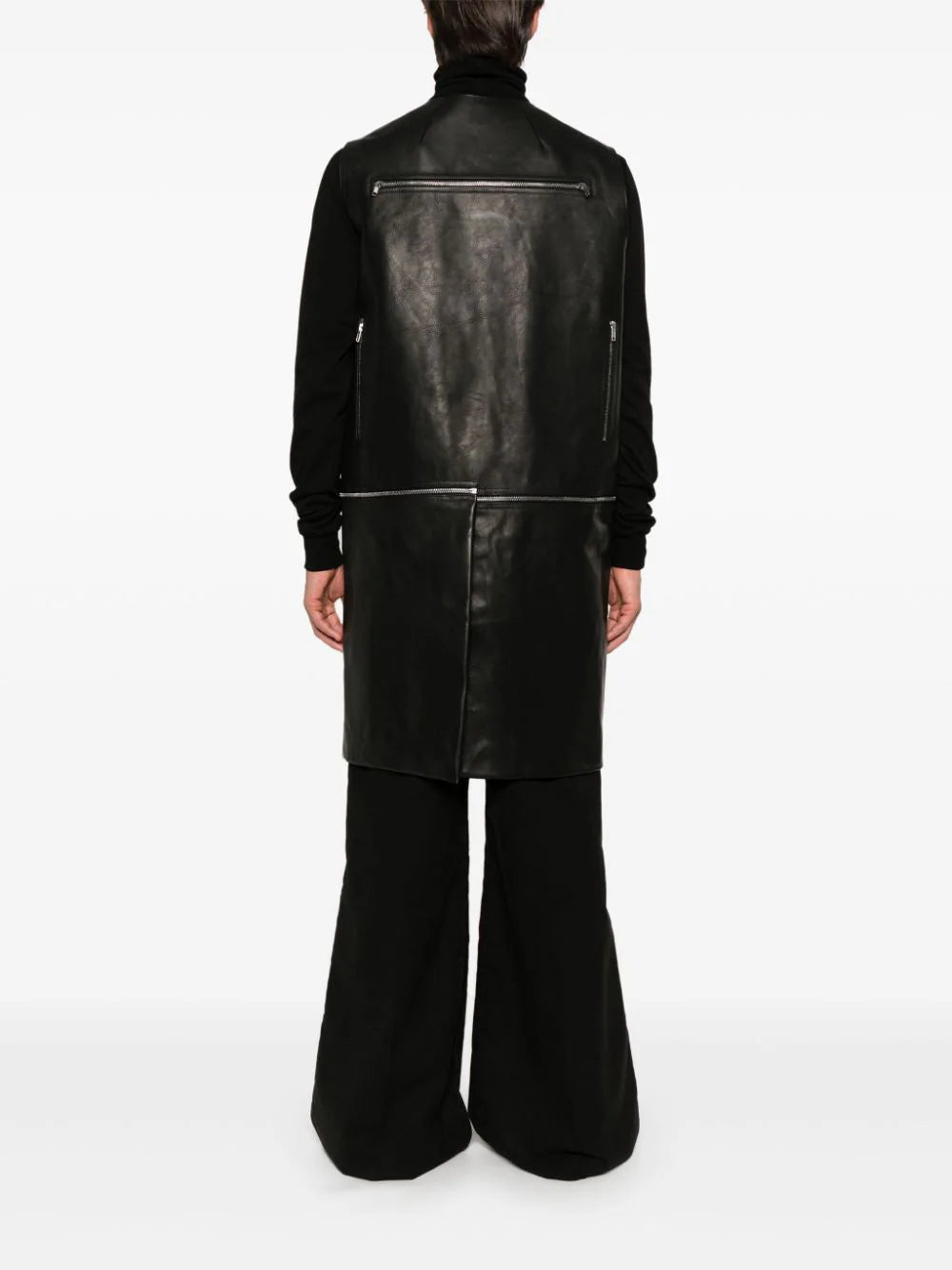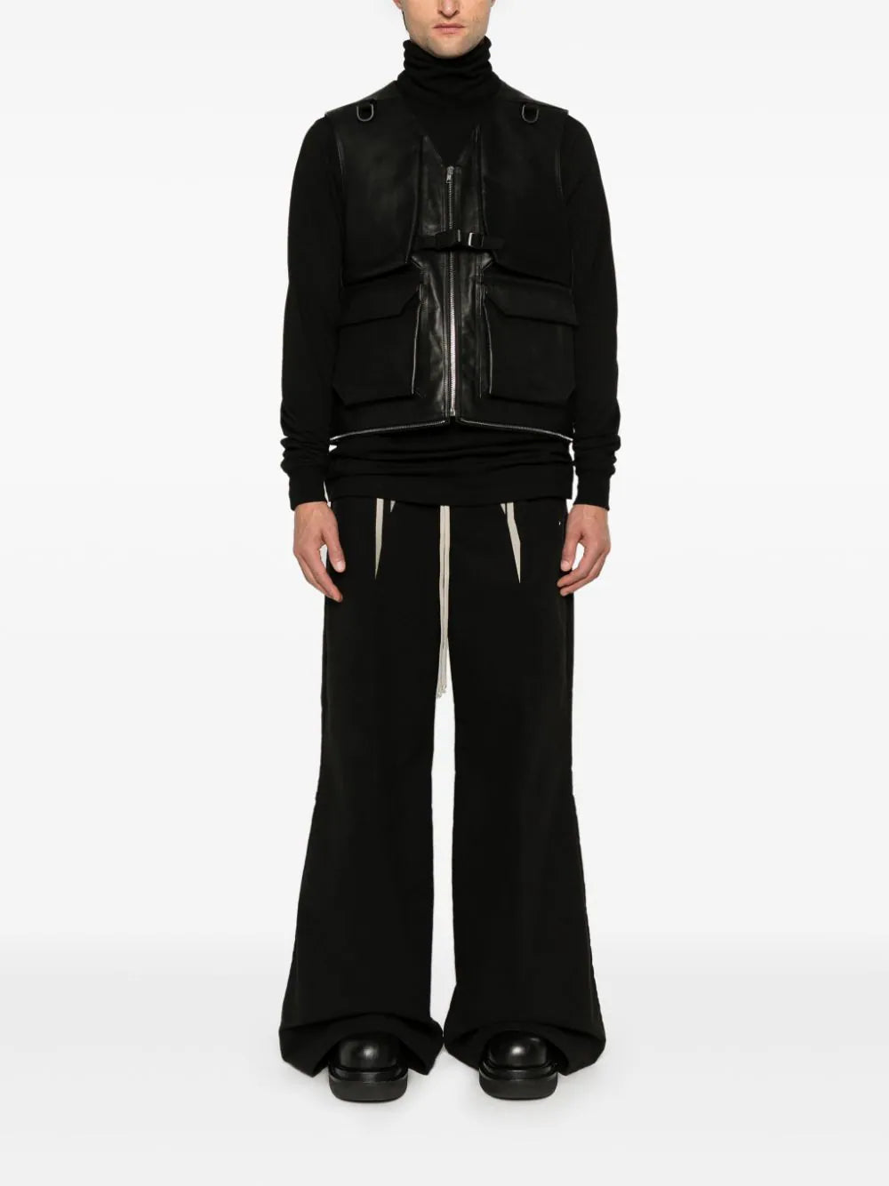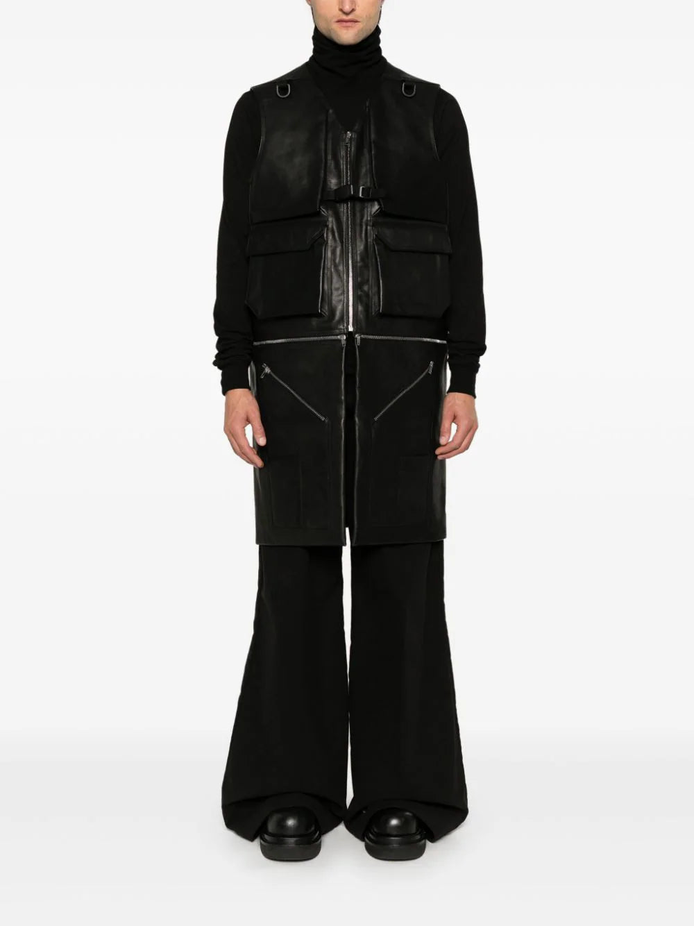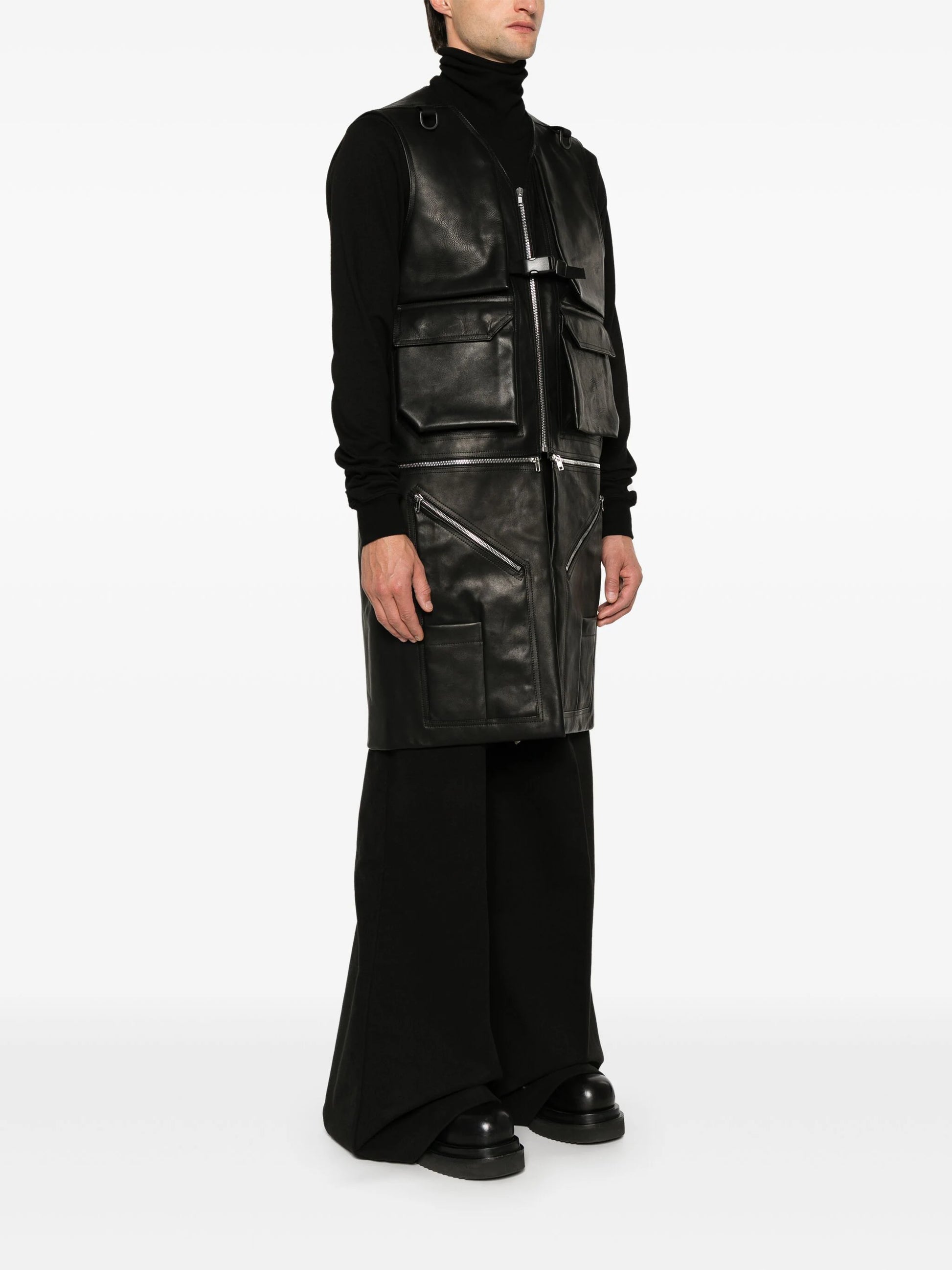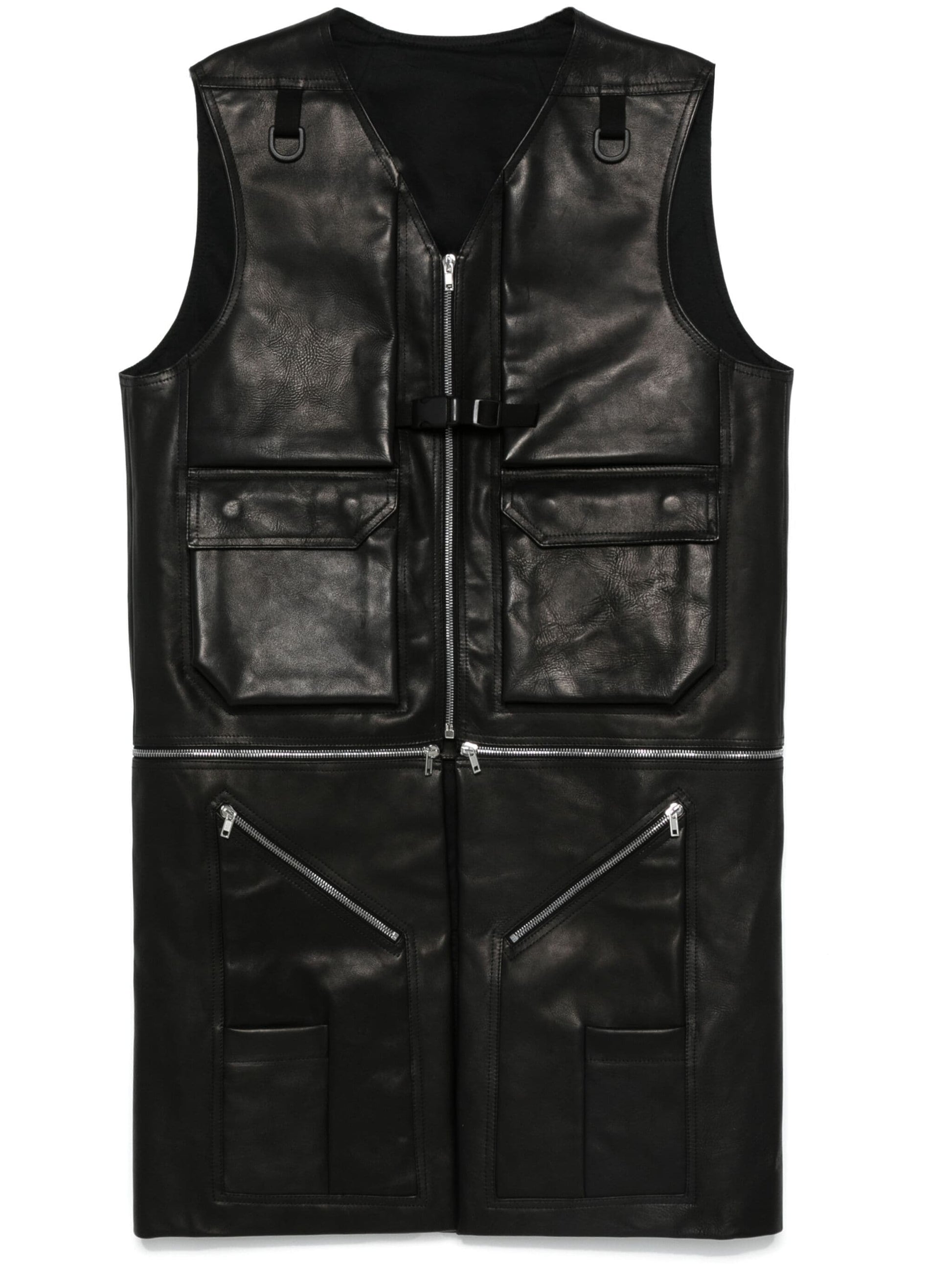 black calf leather smooth grain front zip fastening buckle fastening sleeveless two front cargo pockets two front zip-fastening pockets two front patch pockets detachable panels three rear zip-fastening pockets full lining straight hem knee-length