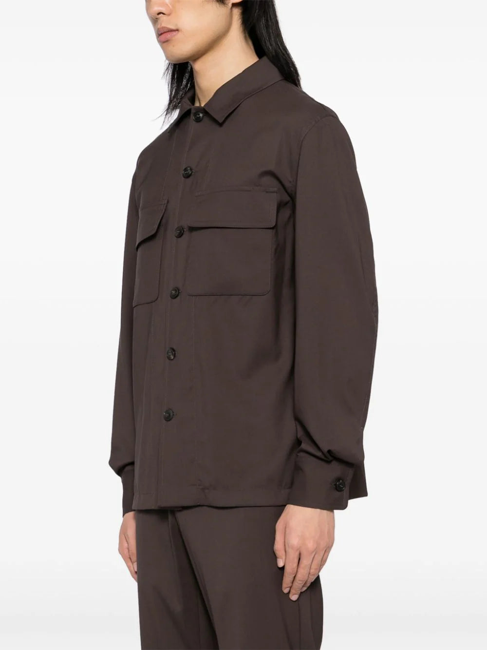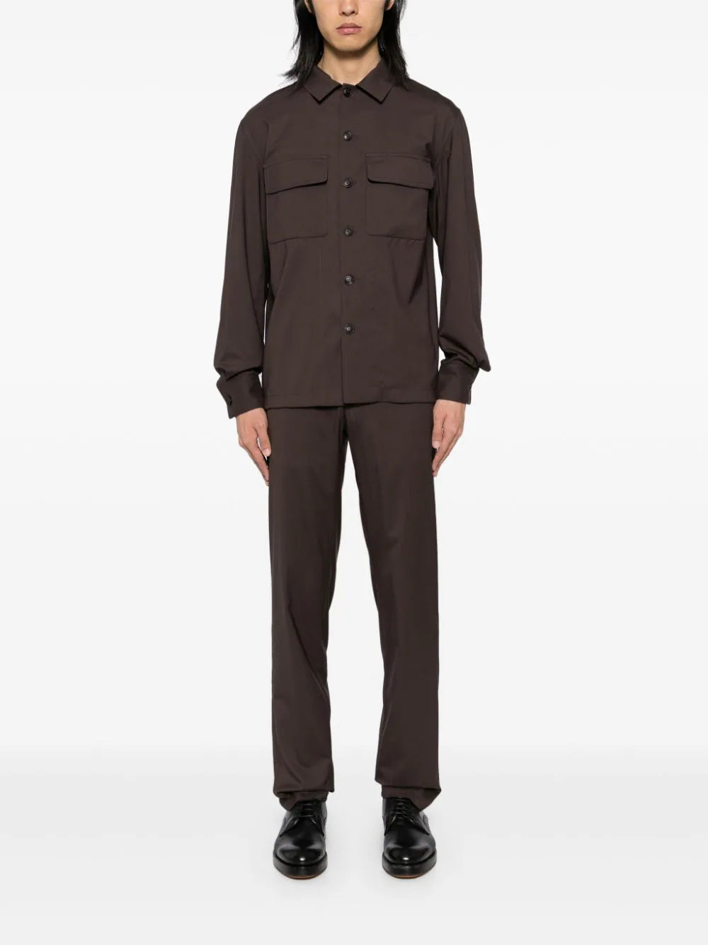charcoal brown virgin wool front button fastening classic collar two chest flap pockets buttoned cuffs long sleeves straight hem