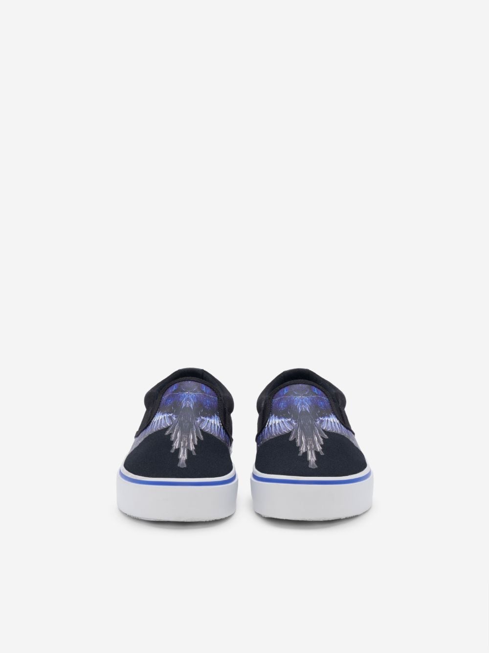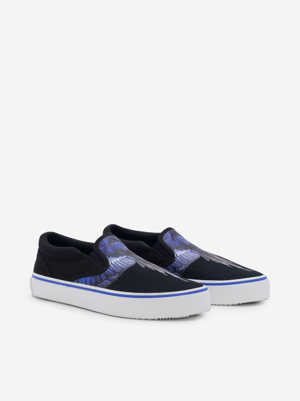 Black/blue/white cotton Wings-print slip-on sneakers from Marcelo Burlon County of Milan featuring wings print, branded insole, round toe, slip-on style and vulcanised-rubber sole.