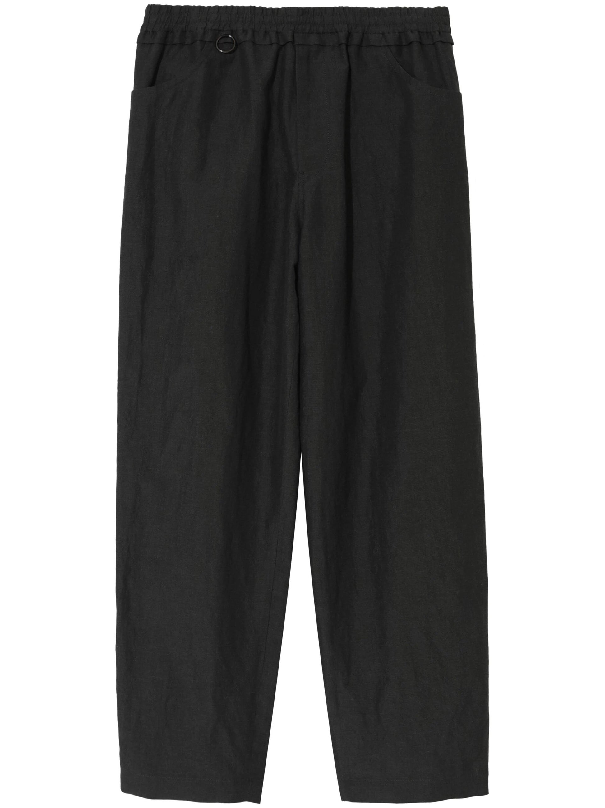black linen-wool blend elasticated waistband D-ring findings slip pockets to the sides straight leg