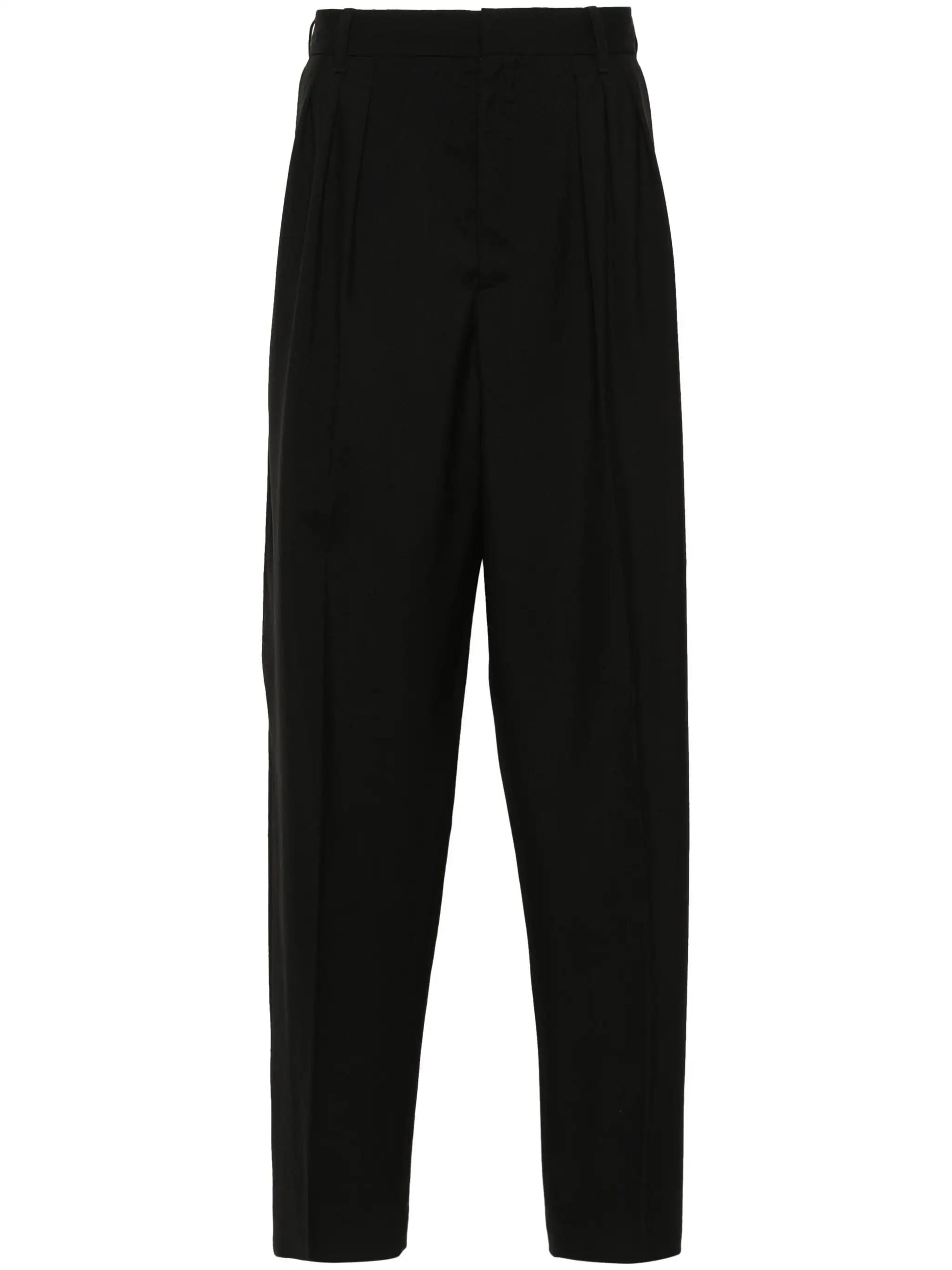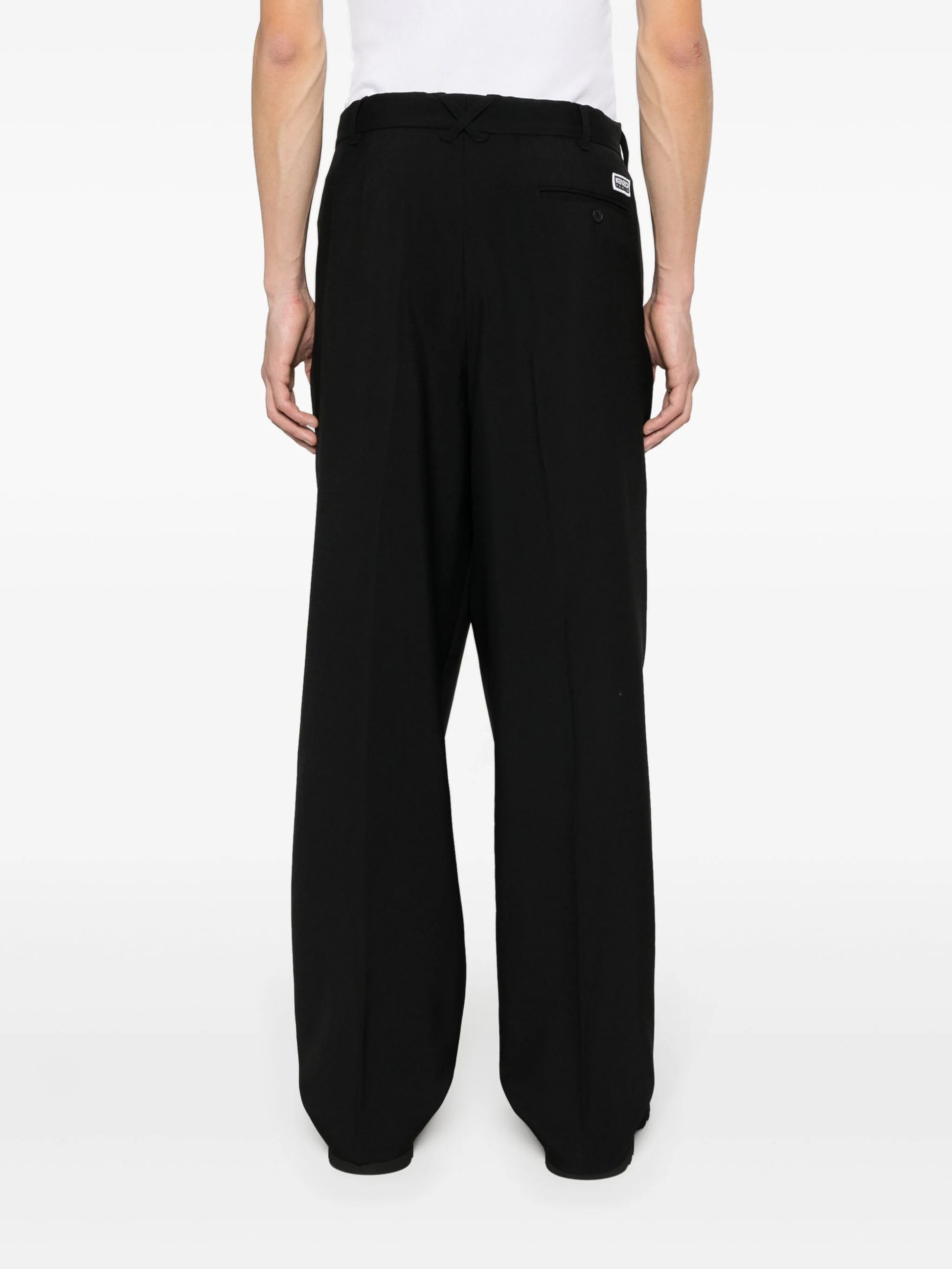 black virgin wool belt loops pleat detailing two side slash pockets logo patch to the rear rear welt pocket concealed front button, hook and zip fastening