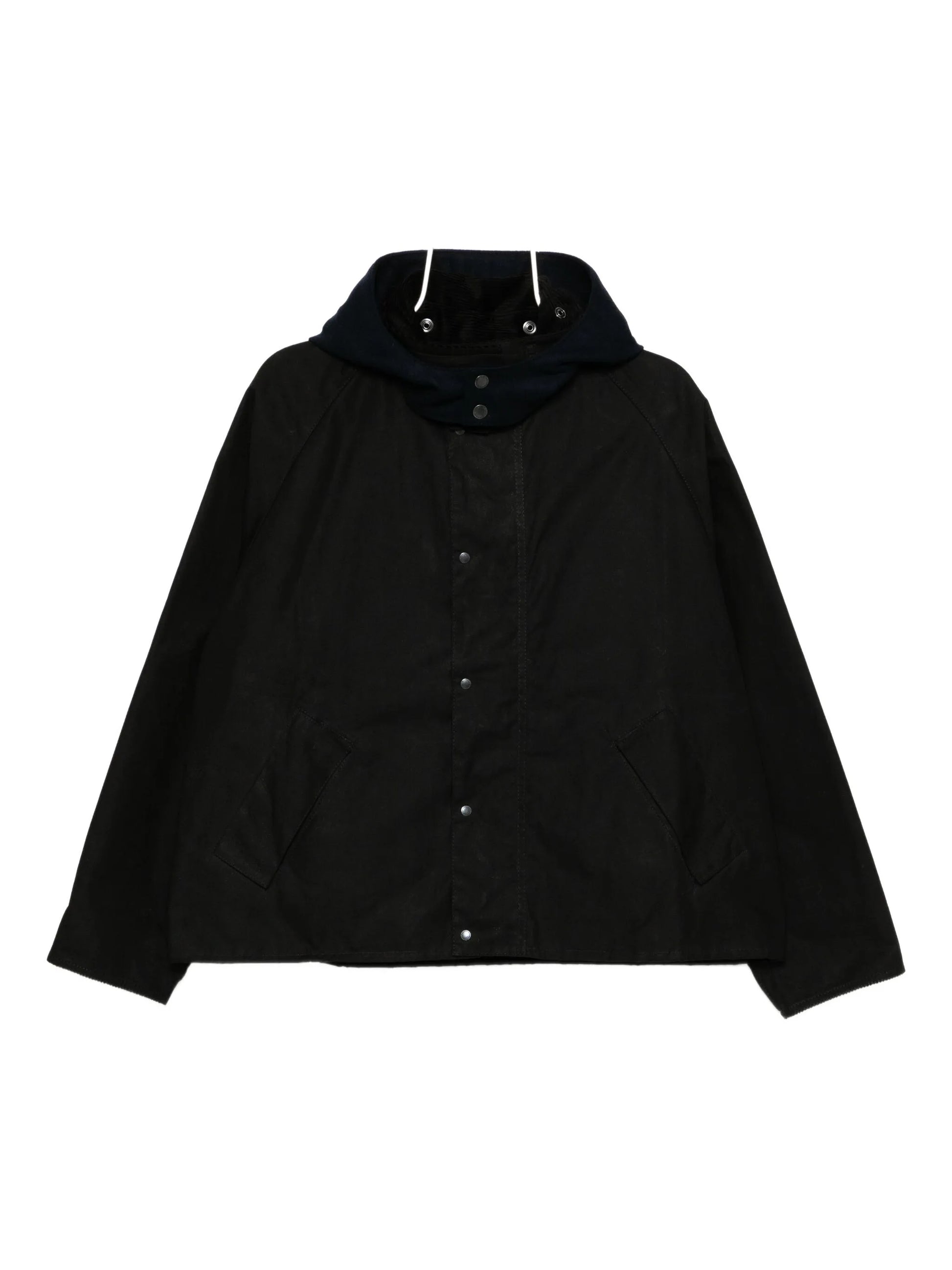 The X Barbour Cruiser Jacket in black offers a sleek, classic design with a front button fastening for a polished look. Equipped with two side welt pockets, it provides practical storage while maintaining a streamlined profile. The long sleeves ensure comfort and coverage, making this jacket a sophisticated and functional choice for professional wear.