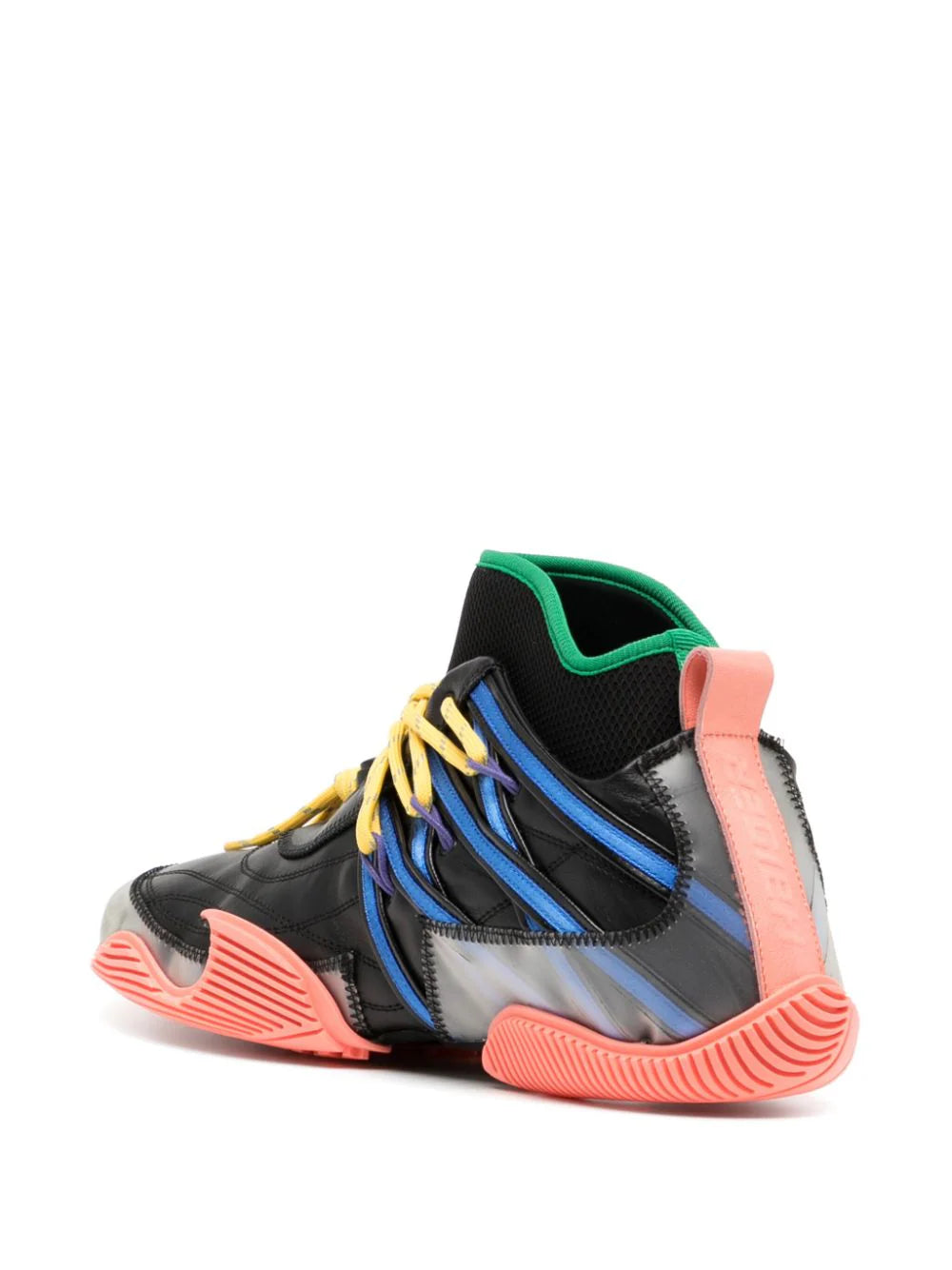 black/multicolour calf leather colour-block panelled design logo print to the side embossed logo to the side semi-sheer panels round toe front lace-up fastening sock-style ankle pull-tab at the heel chunky rubber sole