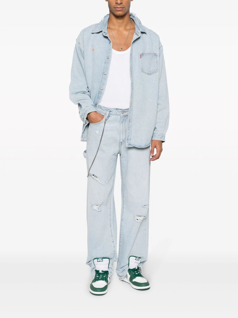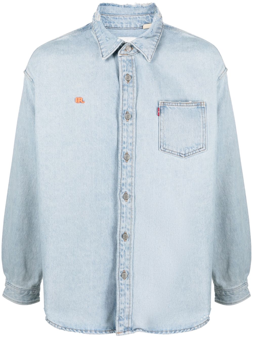 x Levi's denim shirt from ERL featuring light blue, cotton, denim, light wash, distressed finish, embroidered logo at the chest, mini logo tag, front button fastening, drop shoulder, long sleeves, chest patch pocket and curved hem.