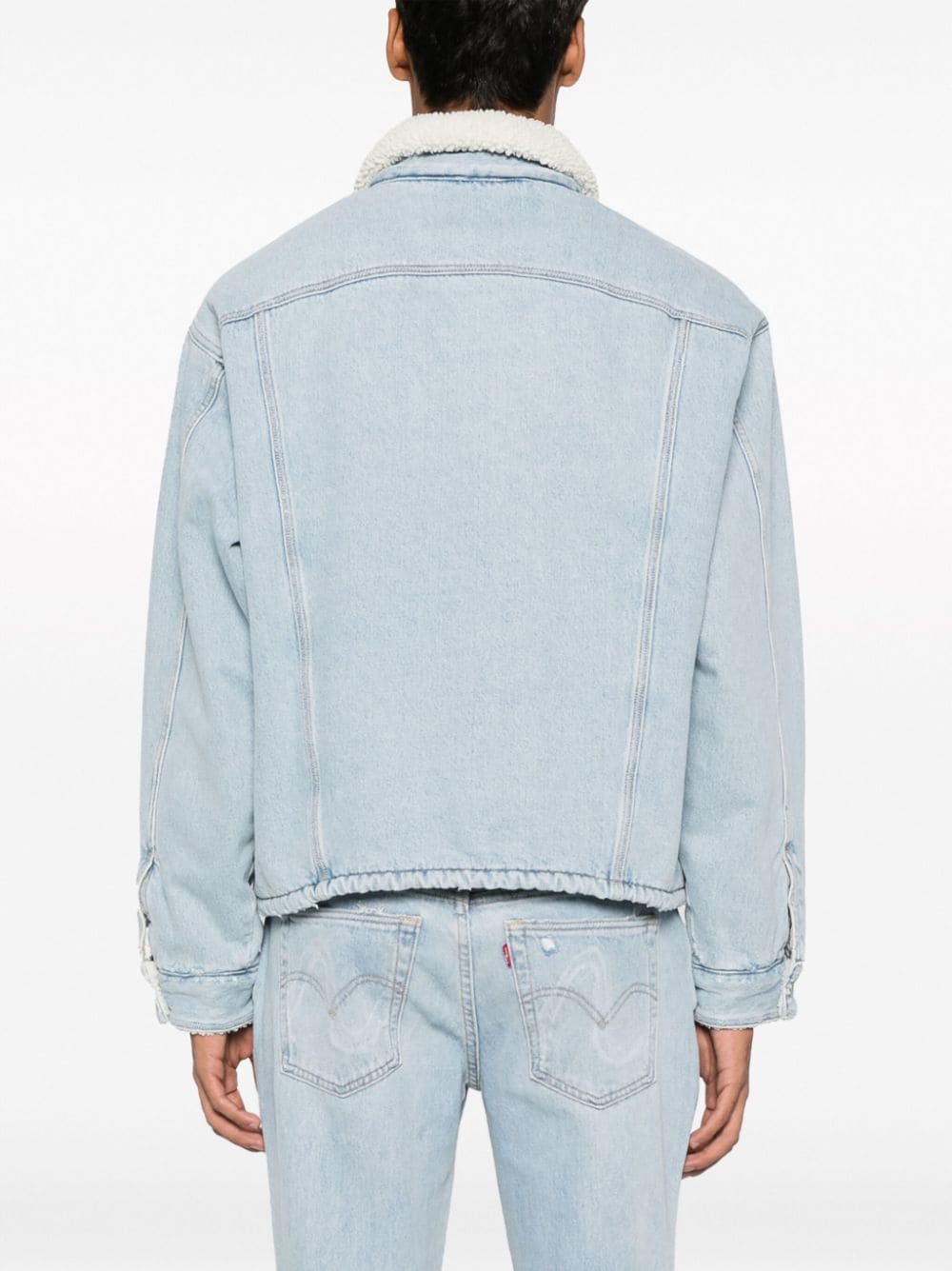 x Levi's Sherpa Trucker denim jacket from ERL featuring light blue, cotton, denim, embroidered logo to the front, faux shearling, contrasting collar, front button fastening, long sleeves, buttoned cuffs, two side welt pockets, two chest flap pockets, straight hem and faux-shearling lining.