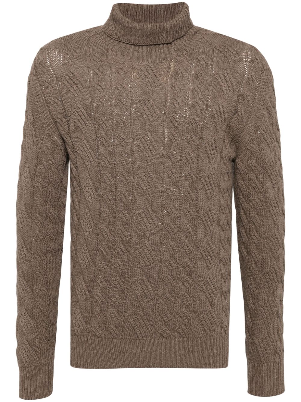 This Zermat Sweater is crafted from a chunky cable knit wool, providing both warmth and style. Its roll neck adds a touch of sophistication, while the long sleeves and ribbed cuffs and hem ensure a comfortable fit. Stay cozy and fashionable in this taupe brown sweater.