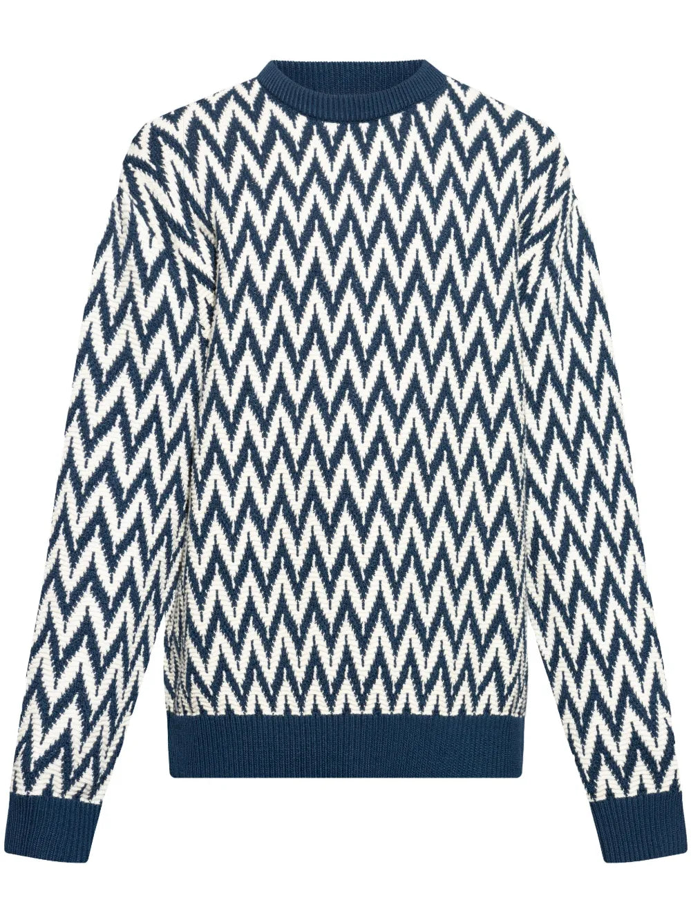 Expertly crafted with a classic blue knit construction, this Zigzag Motif Sweater features a round neck, long sleeves, and ribbed cuffs and hem for a comfortable fit. The intricate zigzag motif adds a touch of style to this timeless piece. Stay warm and fashionable in this must-have sweater.