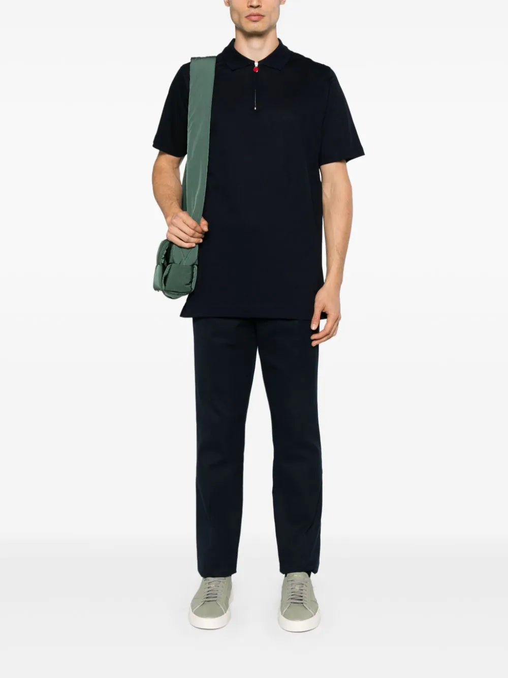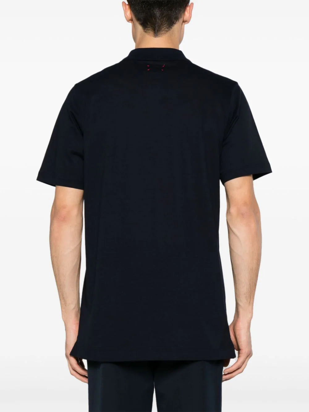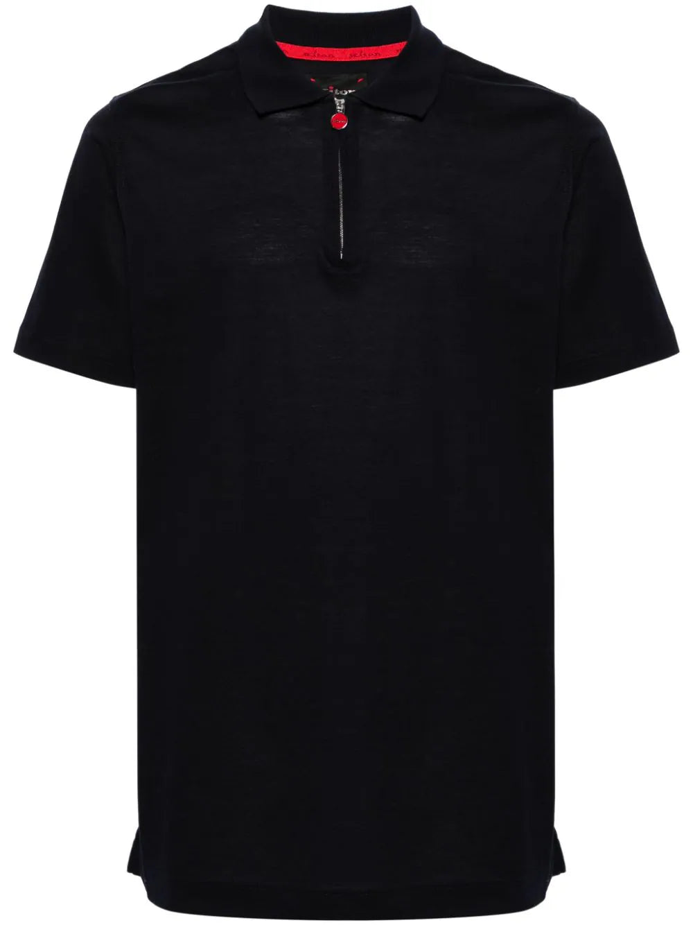 navy blue cotton piqué weave polo collar half front zip fastening branded zip puller short sleeves straight hem