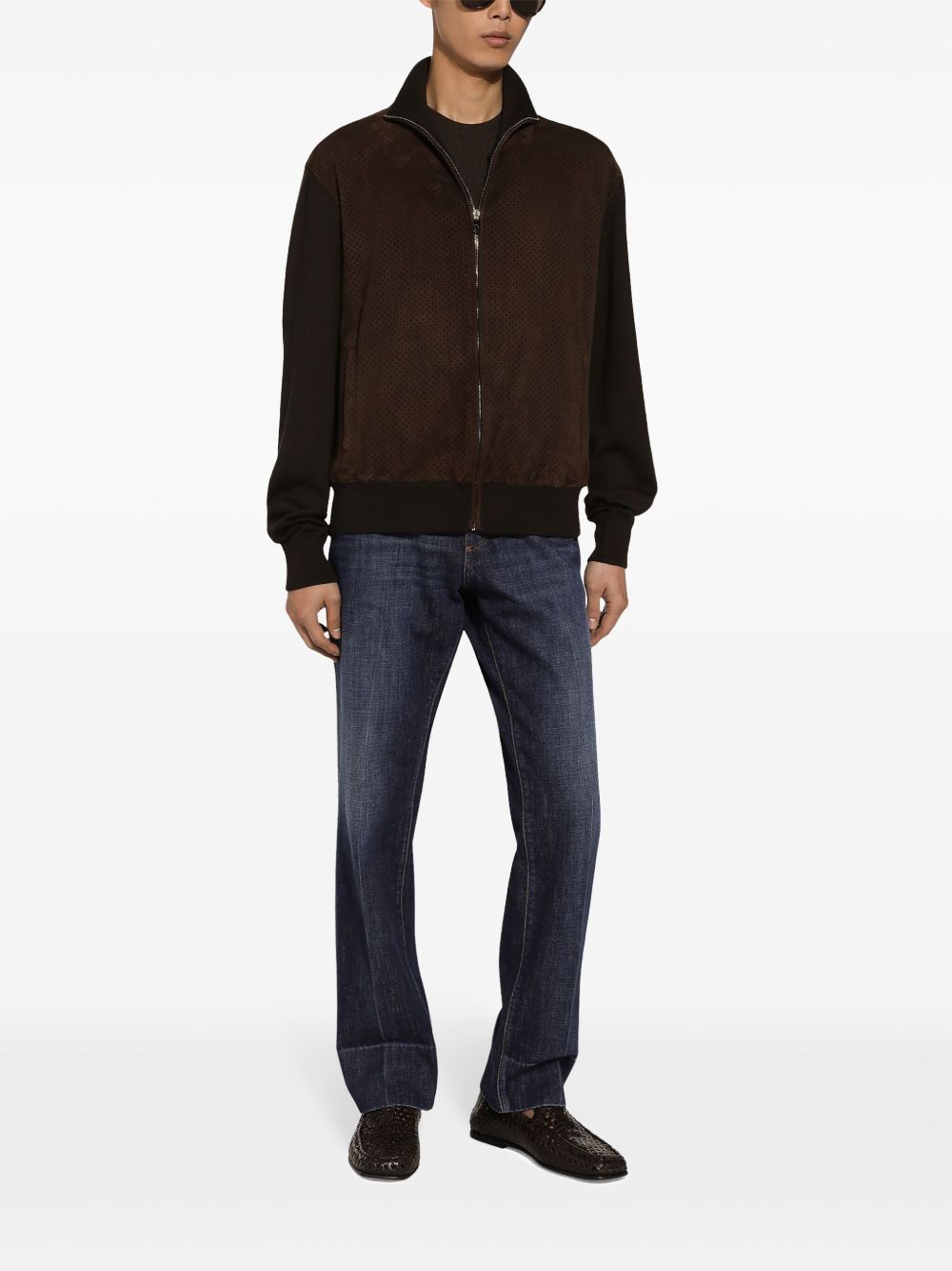 This Zip-Up Bomber Jacket features a unique panelled design made with brown virgin wool and sheep suede. The perforated detailing adds a touch of texture while the roll neck and front zip fastening provide comfort and convenience. With two zip-fastening pockets and ribbed cuffs and hem, this jacket is both stylish and functional.