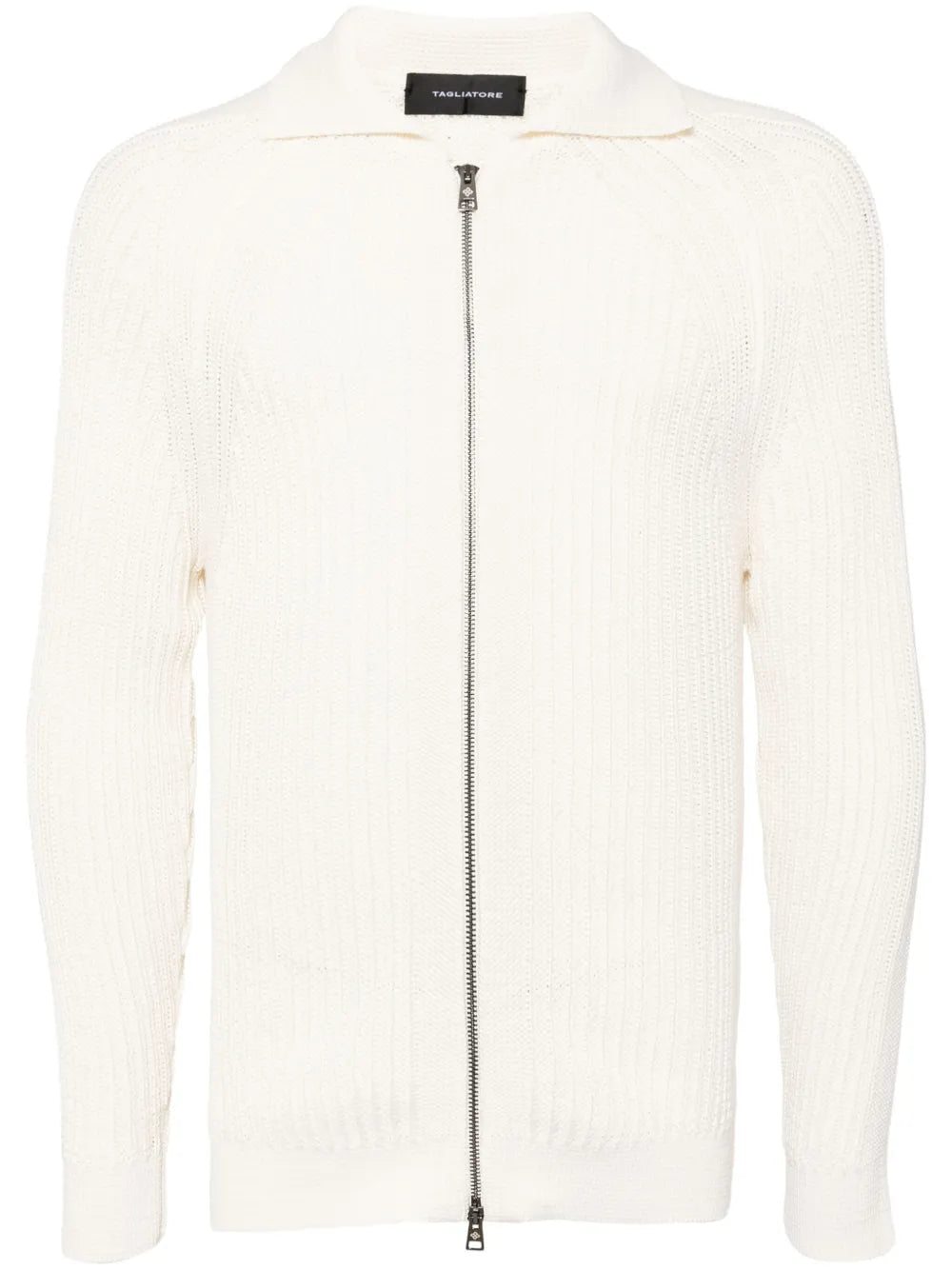 This white zip-up cardigan features a front zip fastening, ribbed cuffs and hem, and a ribbed knit design. Made with high-quality material, it provides both style and comfort in one versatile garment. Perfect for any occasion, this cardigan is a must-have addition to your wardrobe.