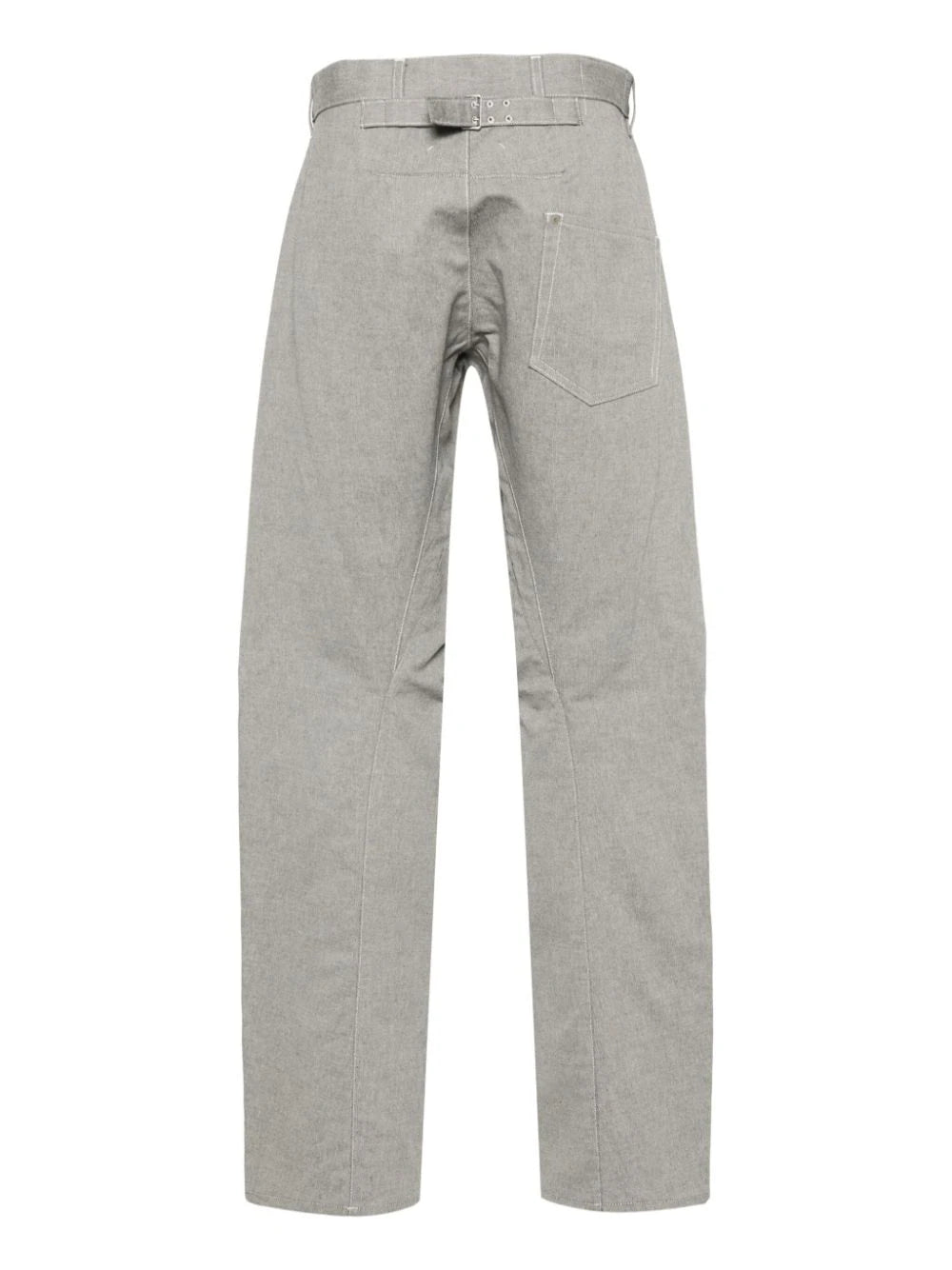 light grey cotton denim straight leg two diagonal pockets to the sides coin pocket rear patch pocket signature four-stitch logo adjustable strap to the rear button fly fastening