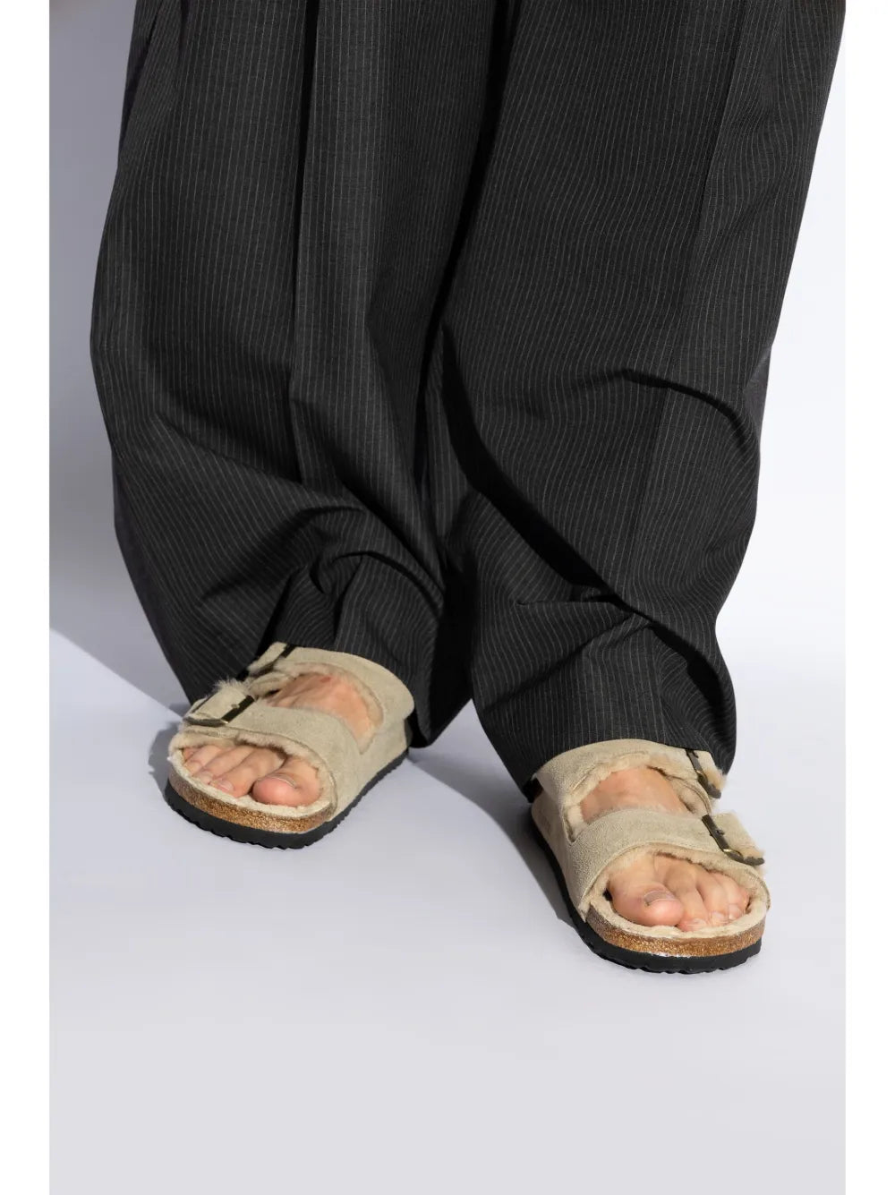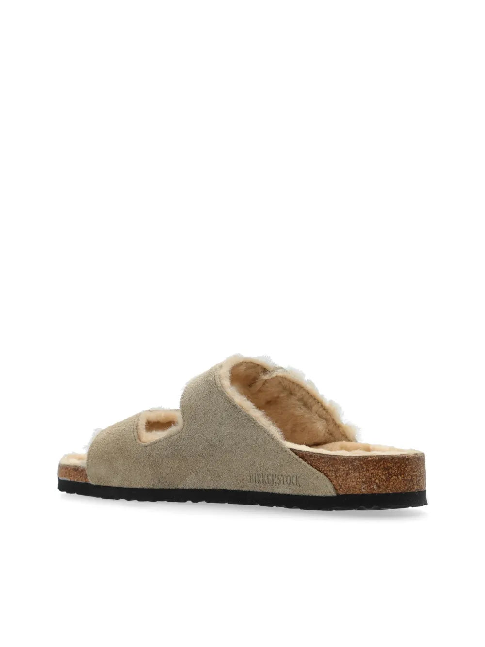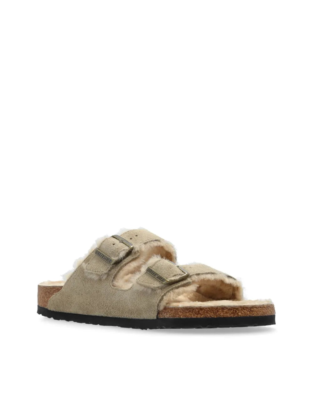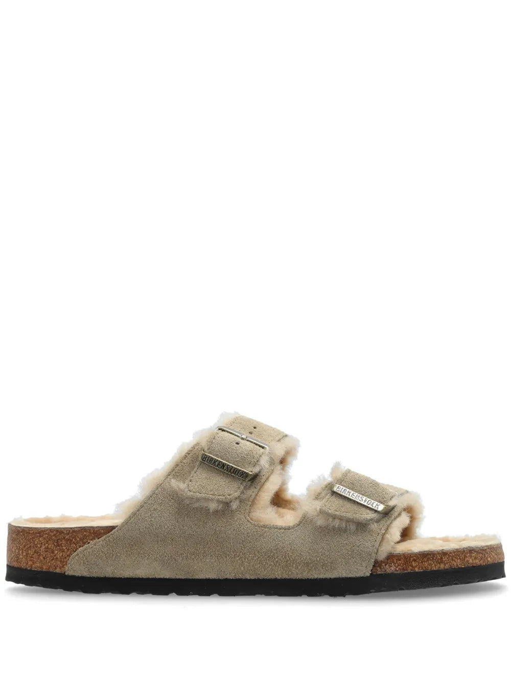 The Arizona Shearling Sandals are expertly crafted with taupe grey leather and a cozy shearling lining. The buckle-strap fastening and slip-on style make them a convenient choice for any occasion. The logo-embossed strap and branded insole add a touch of stylish detail. Stay comfortable and fashionable in these must-have sandals.