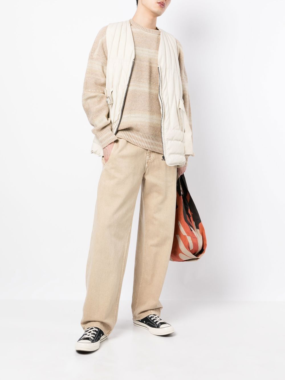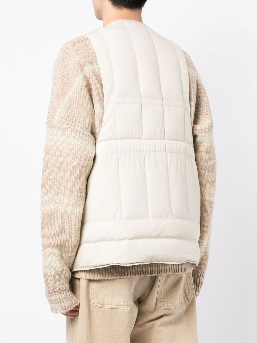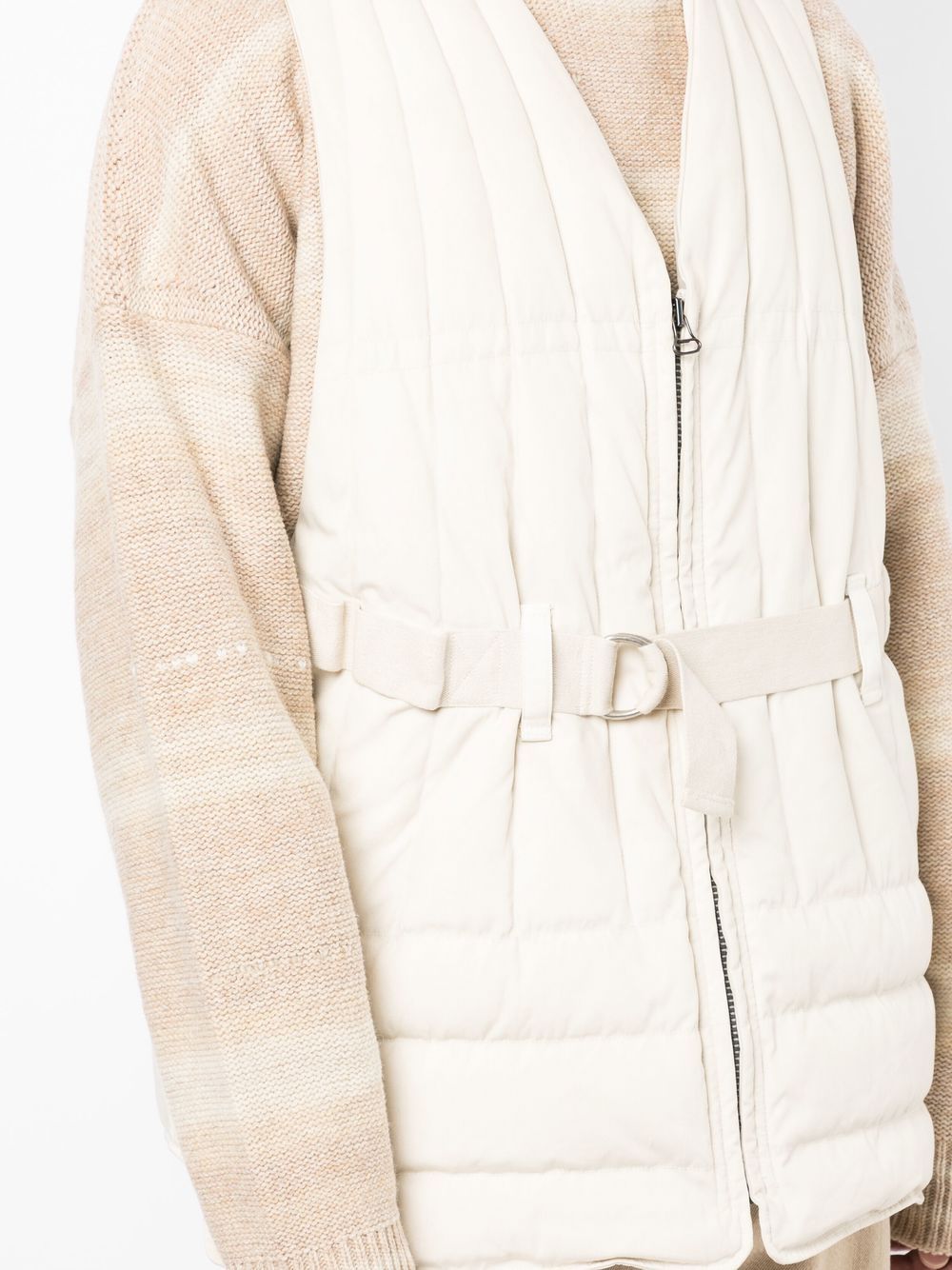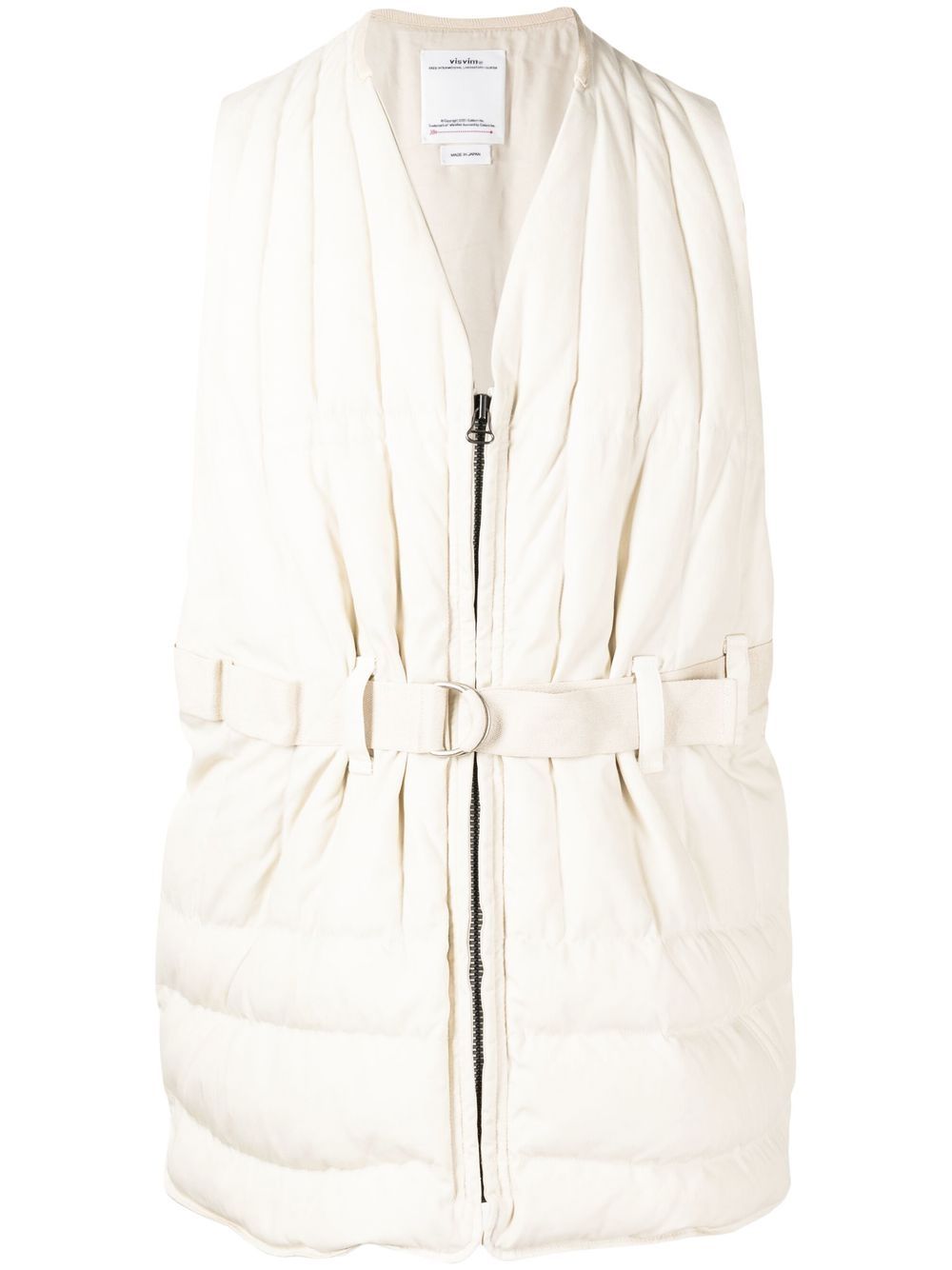 belted padded gilet from visvim featuring off-white, cotton blend, front zip fastening, belted waist, padded design and V-neck.