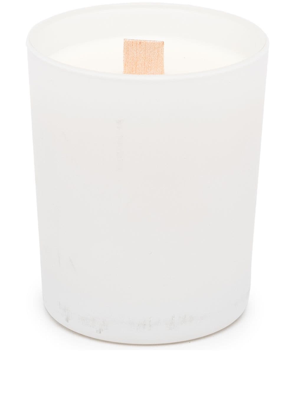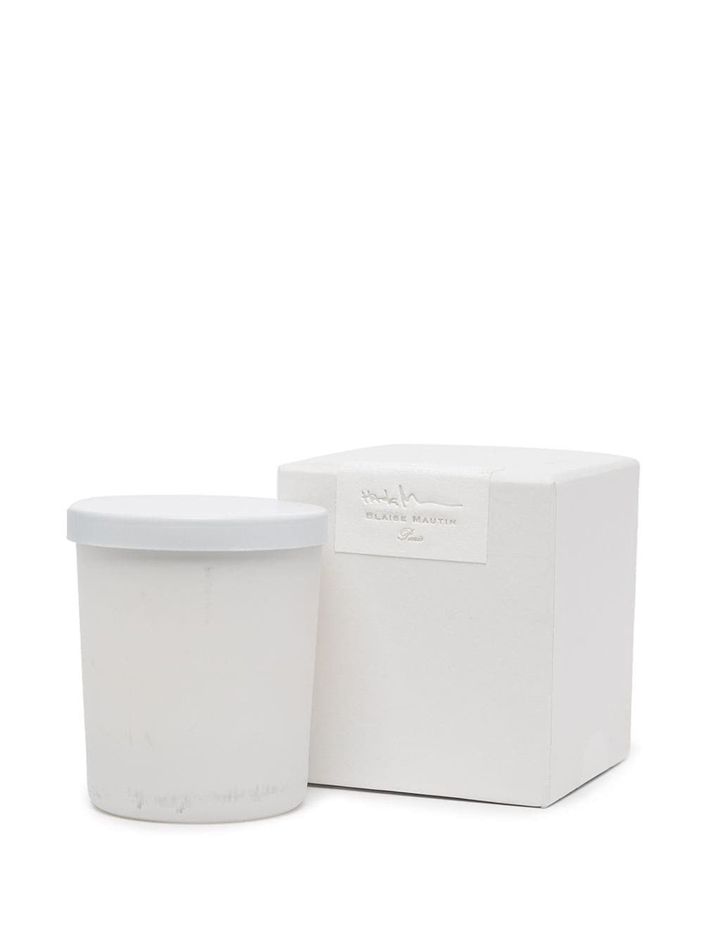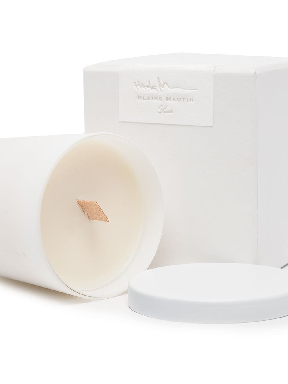 White wax Blaise Mautin scented candle from visvim featuring round frame, single wooden wick and top lid.