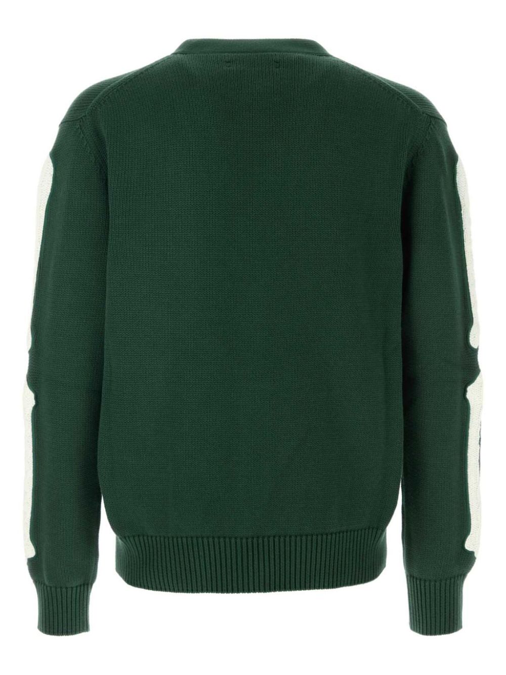 This Bone-Embroidered Cardigan is a forest green, V-neck sweater with a front button fastening and ribbed cuffs and hem. Made with high-quality materials, this cardigan is both stylish and comfortable. Perfect for layering during the colder months, it adds a touch of sophistication to any outfit.