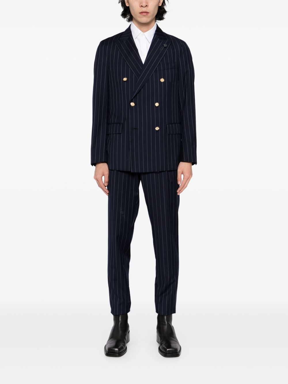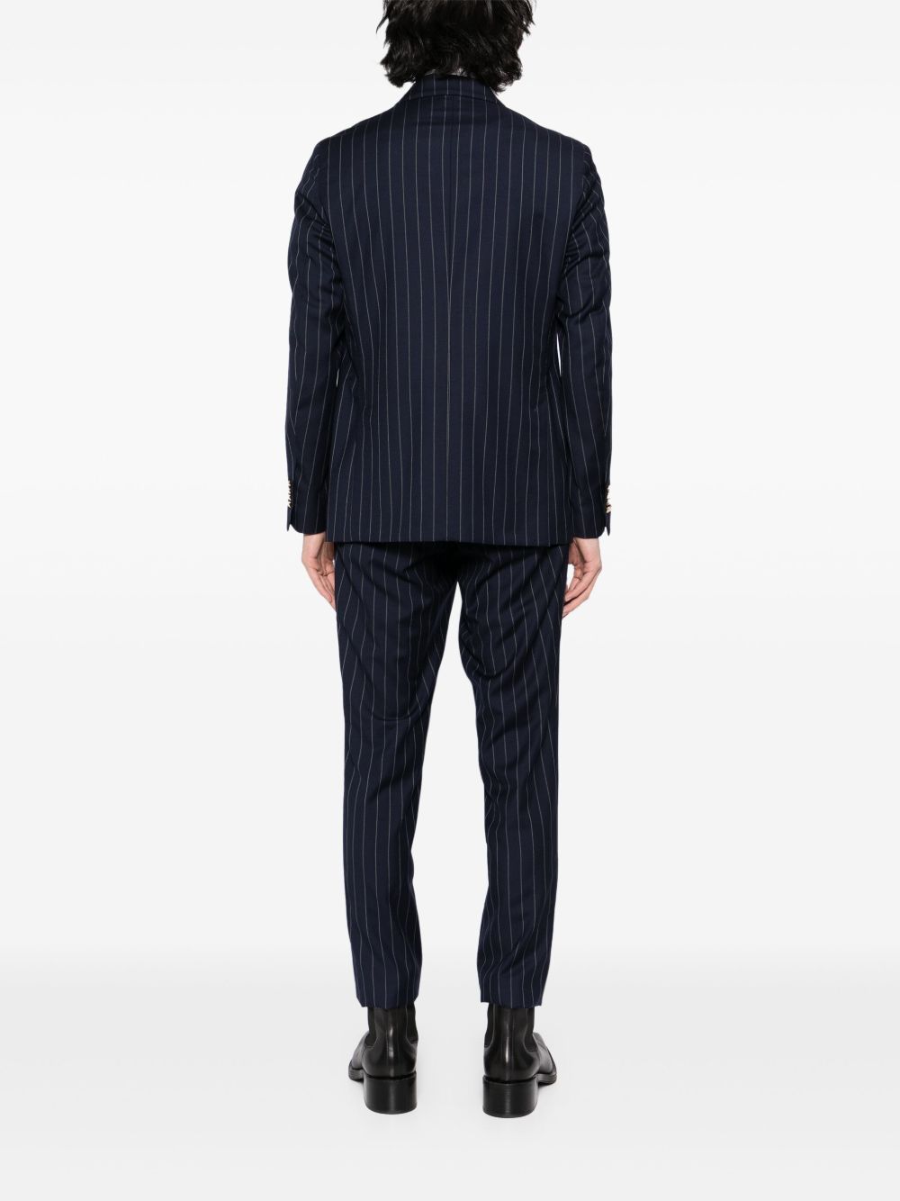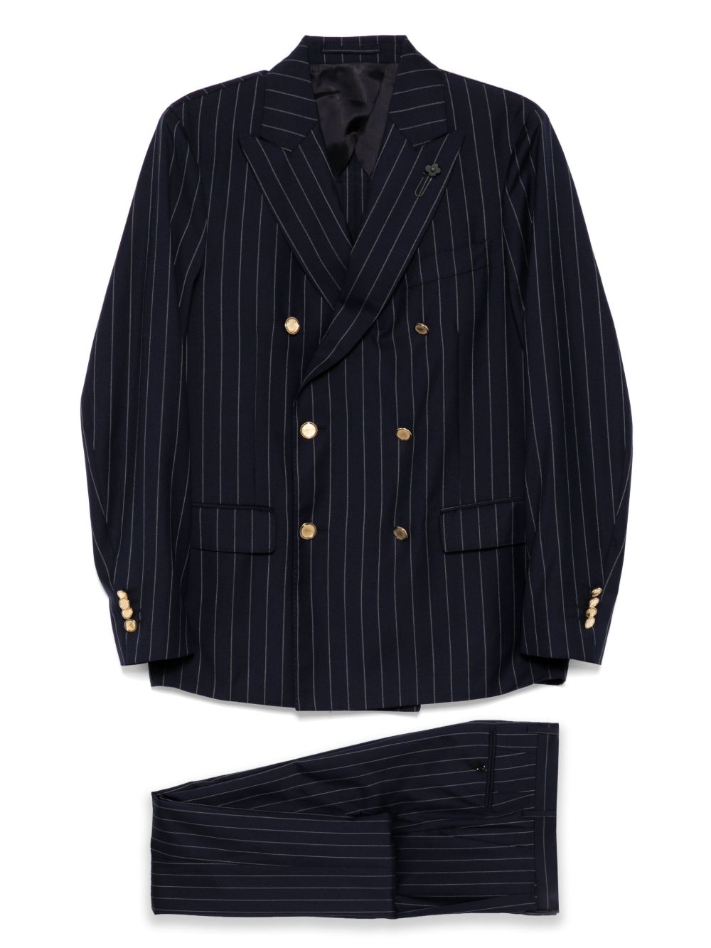 Expertly crafted from fine, navy blue fabric with a classic double-breasted button fastening, this suit is sure to elevate your style. The subtle stripe print adds a touch of sophistication, while the English rear vents provide comfort and ease of movement. Perfect for any formal occasion.