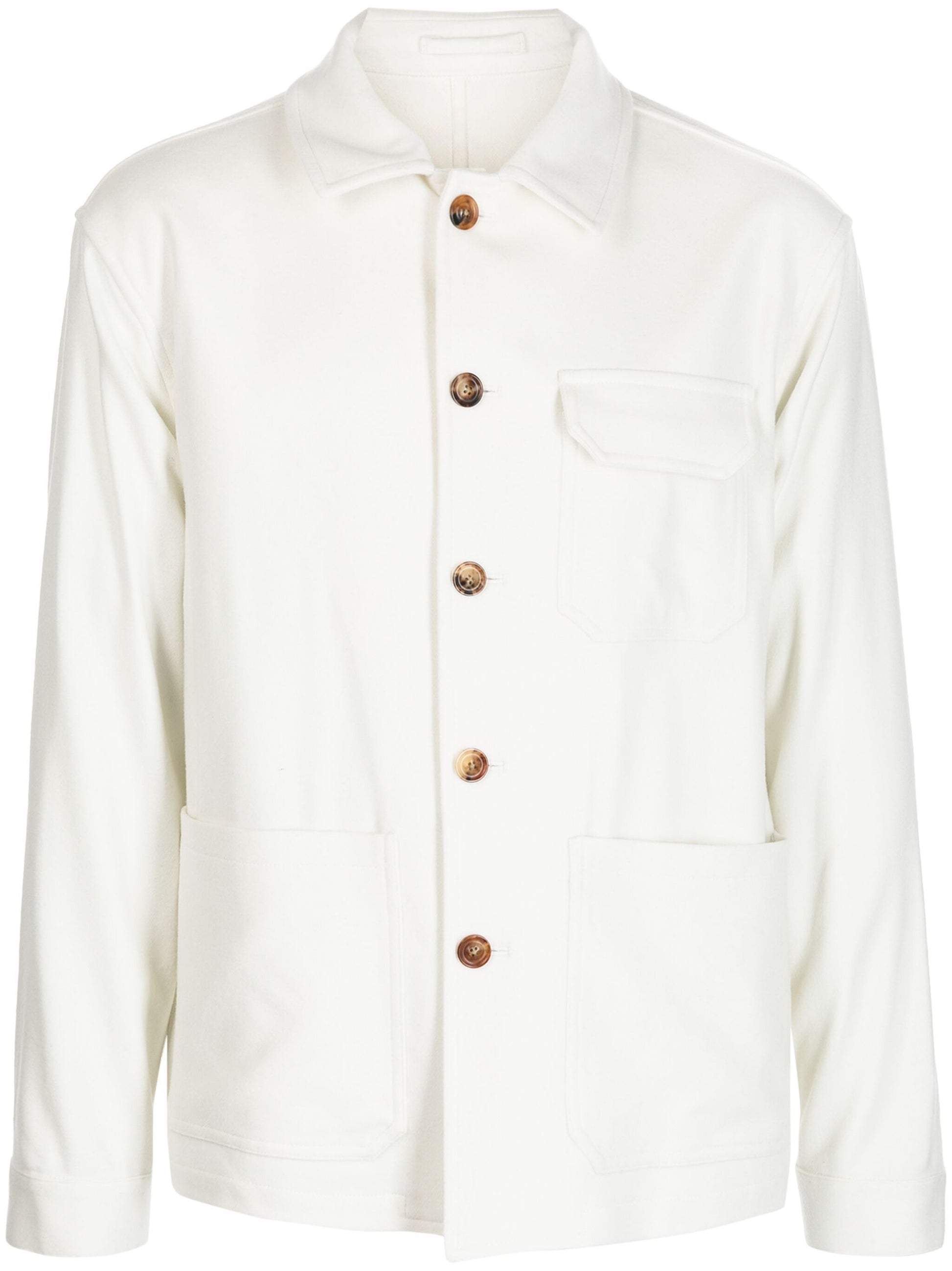 Expertly crafted from high-quality white cotton, this Buttoned Cotton Shirt Jacket features a classic collar and long sleeves for added style and versatility. With two front patch pockets and a front flap pocket, this jacket offers convenience and functionality. The front button fastening ensures a secure fit, while the straight hem completes the clean and sophisticated look.