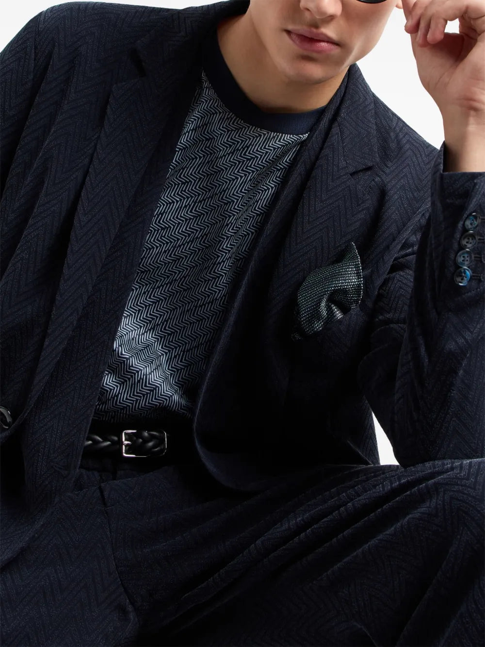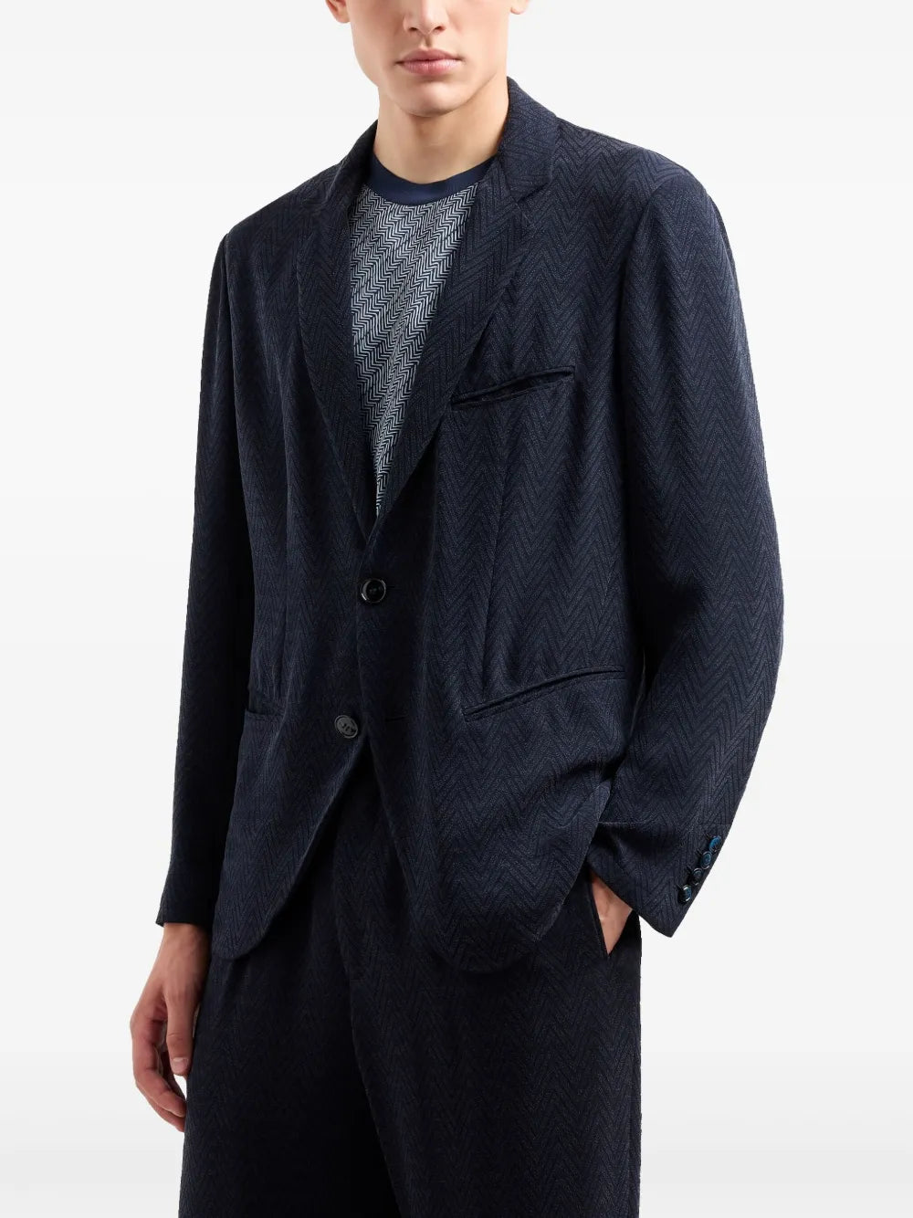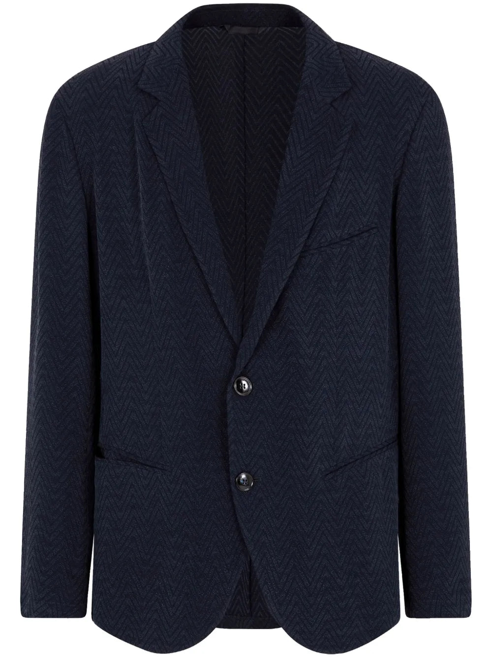 Introducing our new Chevron-Pattern Blazer, expertly crafted in a timeless oxford blue. With button fastening and jetted pockets, this blazer offers convenience and style. The jetted chest pocket and buttoned-cuff sleeves add a touch of sophistication. Perfect for any occasion, this blazer is a must-have for any wardrobe.