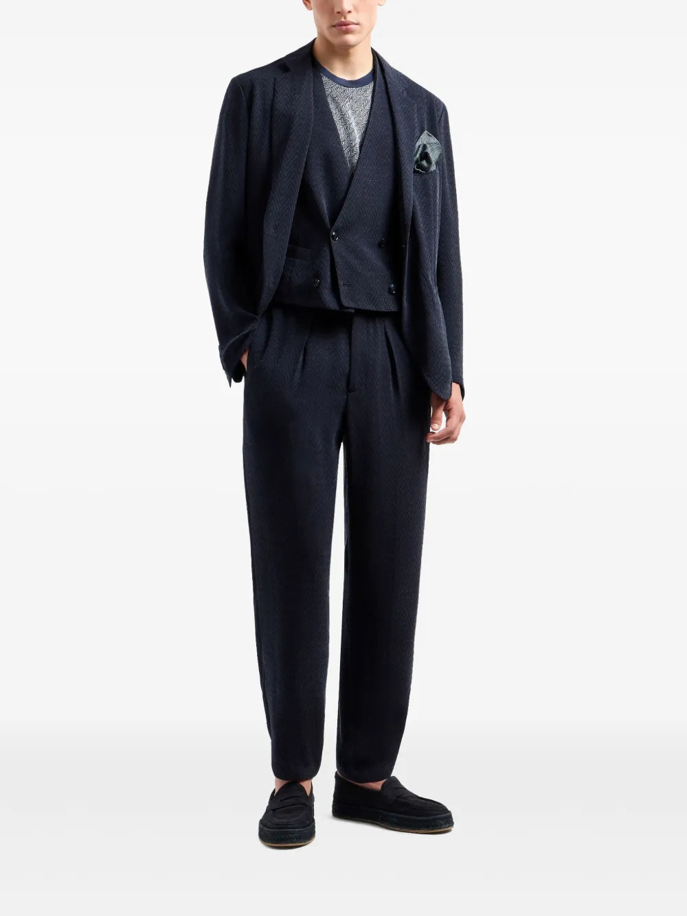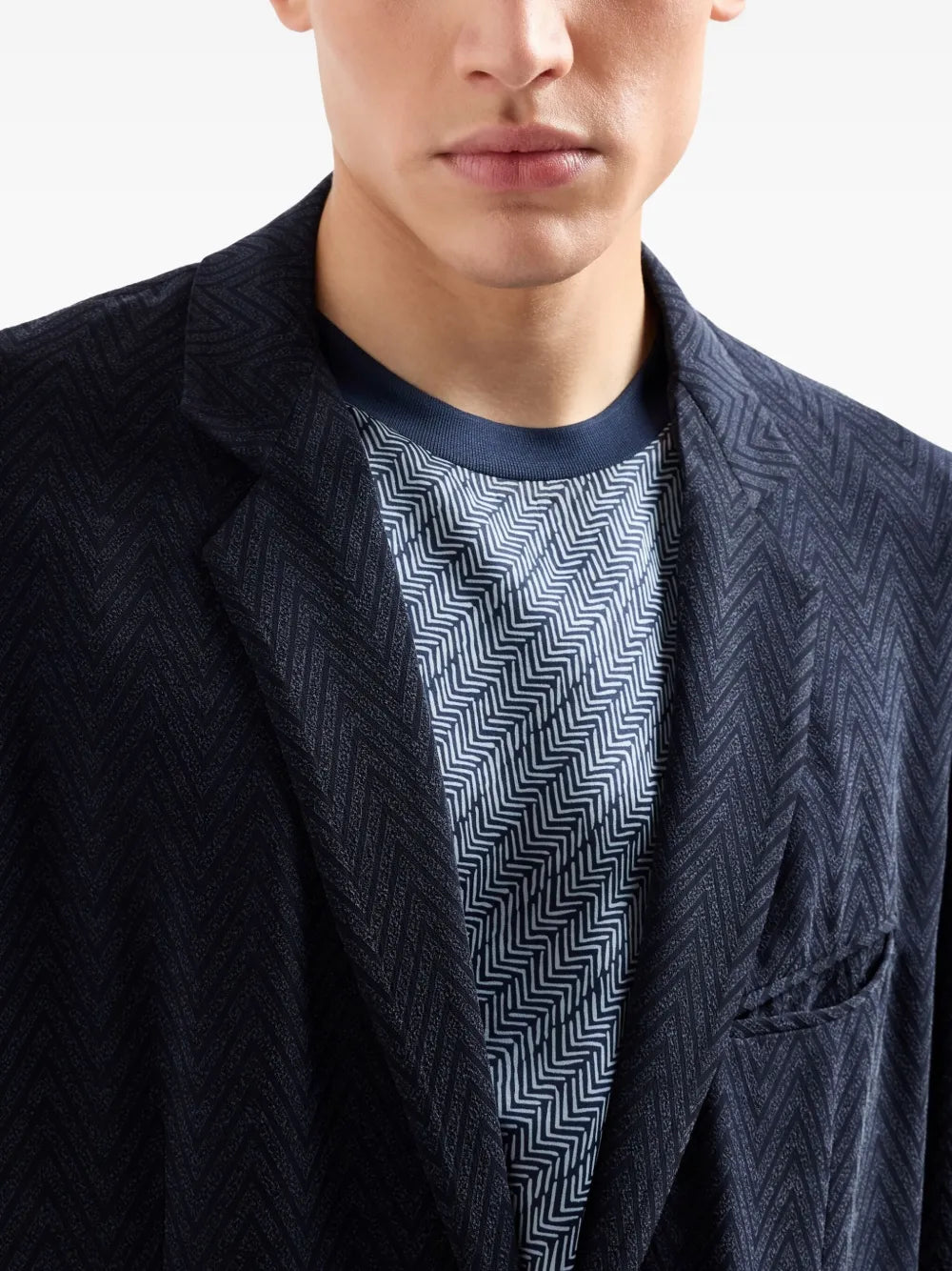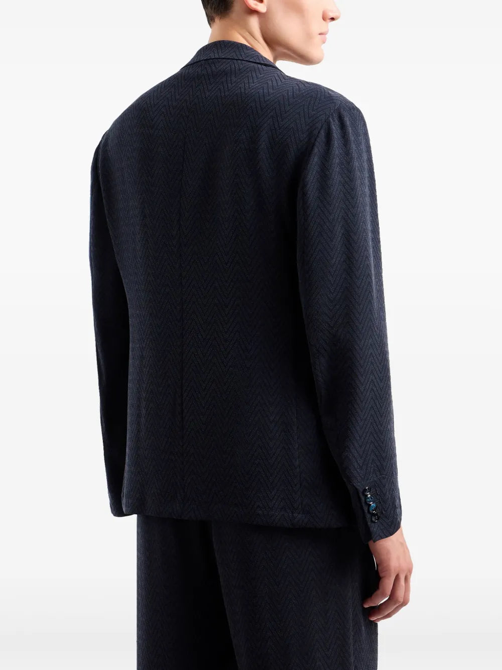 Introducing our new Chevron-Pattern Blazer, expertly crafted in a timeless oxford blue. With button fastening and jetted pockets, this blazer offers convenience and style. The jetted chest pocket and buttoned-cuff sleeves add a touch of sophistication. Perfect for any occasion, this blazer is a must-have for any wardrobe.