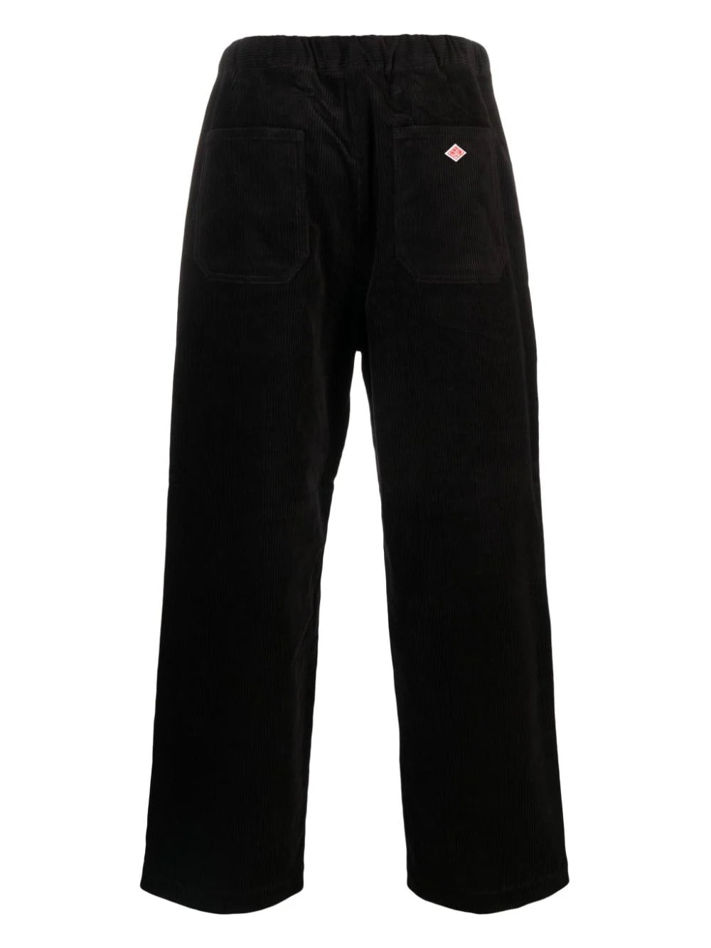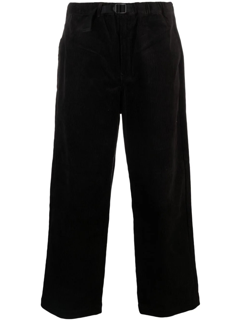 black cotton corduroy mid-rise slide-buckle fastening elasticated waistband two side slash pockets two rear patch pockets wide leg