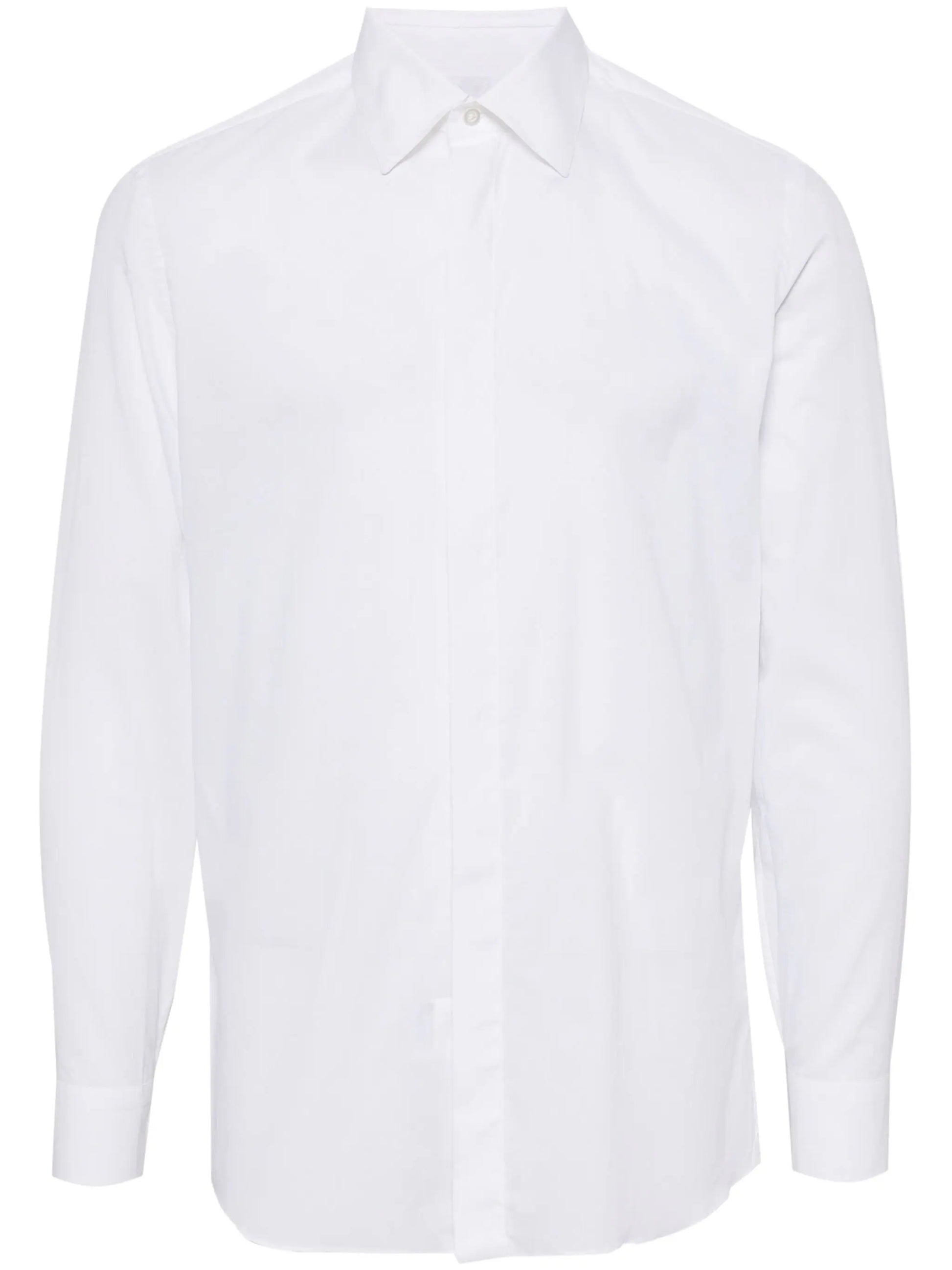 white cotton front button fastening long sleeves buttoned cuffs curved hem