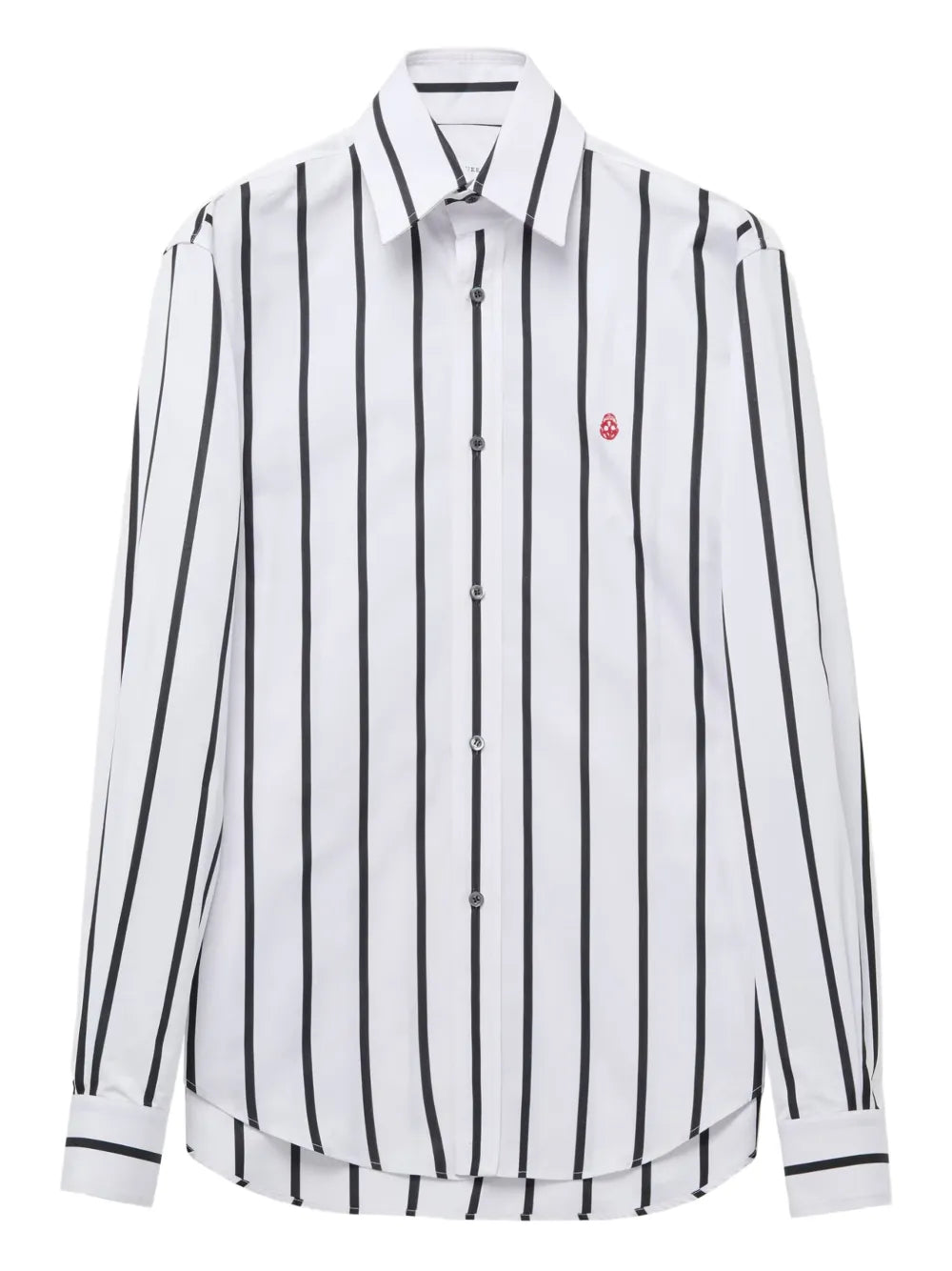 This white cotton shirt features a front button fastening, long sleeves, and a curved hem. The shirt also includes a logo print at the chest. Made with soft and breathable cotton, this shirt is both stylish and comfortable. Perfect for any occasion, it's an essential addition to any wardrobe.
