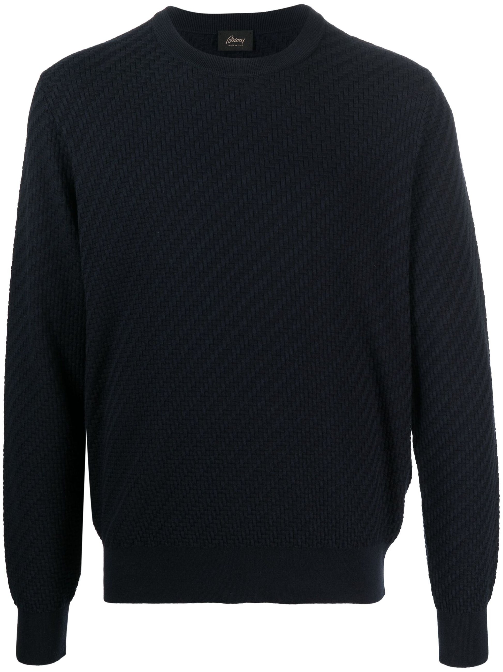 This navy blue crew-neck jumper expertly combines a cotton-silk blend knitted construction with ribbed edges for a comfortable and stylish fit. With long sleeves and a straight hem, it's perfect for any occasion. Enjoy the benefits of this luxurious fabric blend for a timeless addition to your wardrobe.
