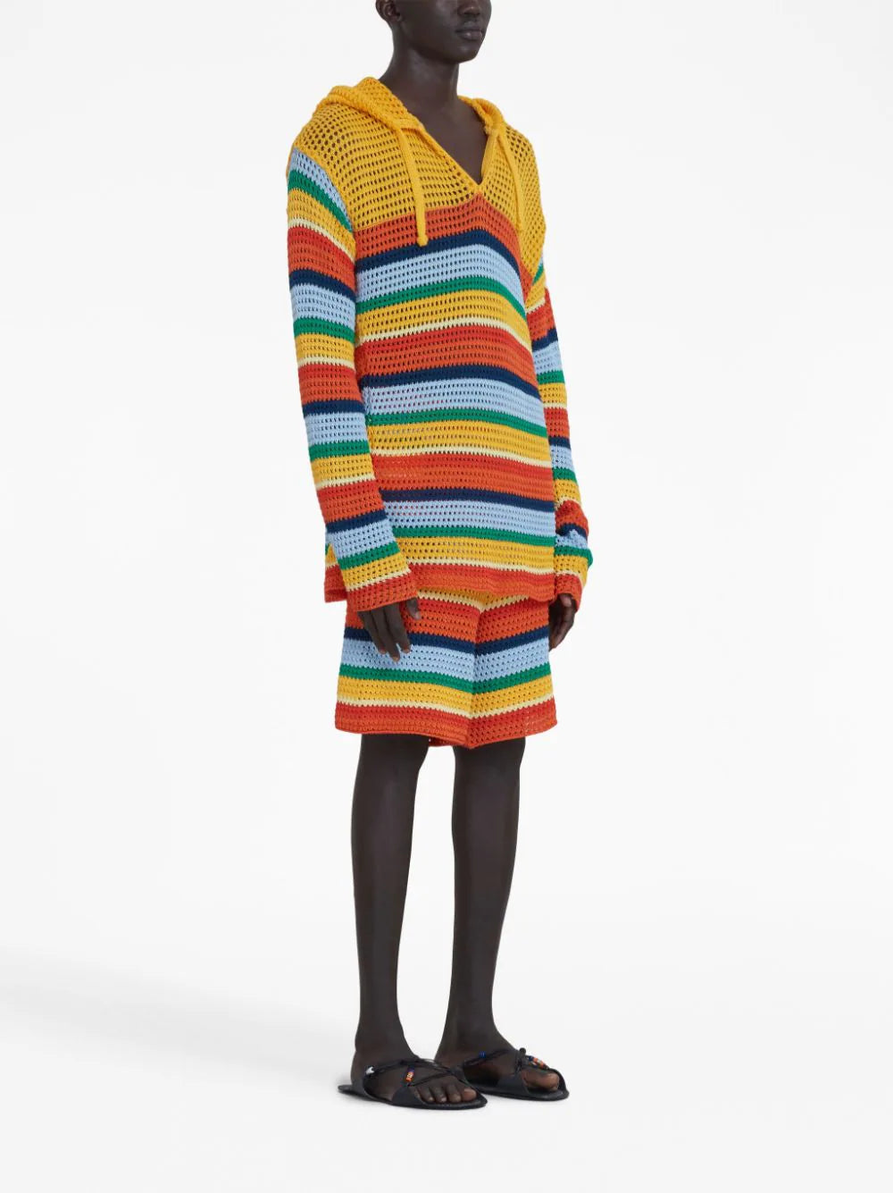 crochet-knit striped shorts from MARNI featuring multicolour, cotton, crochet knit, horizontal stripe pattern, knee-length, elasticated waistband and two side inset pockets.