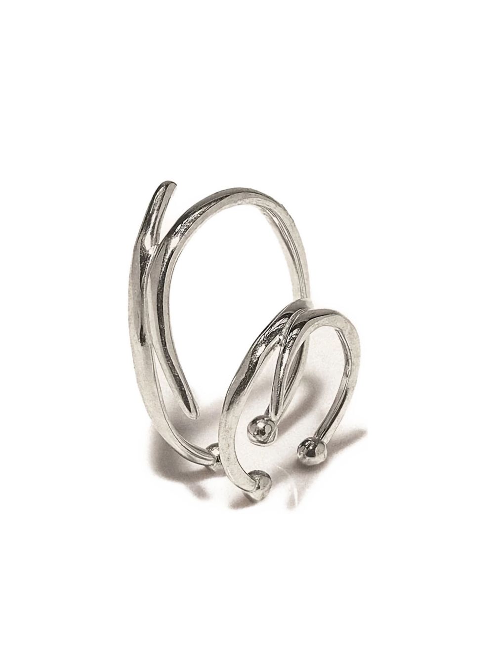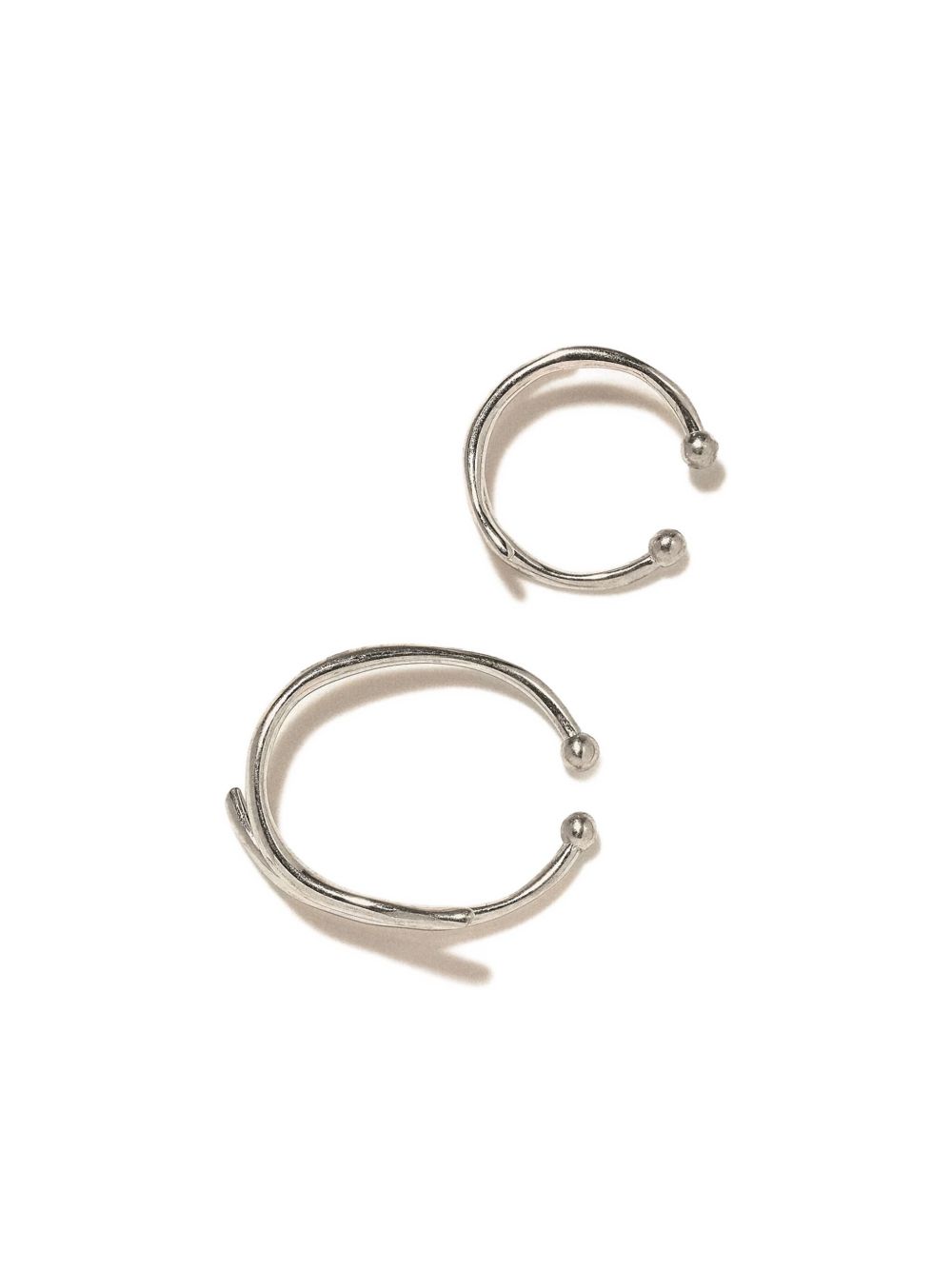 These silver-tone ear cuffs feature a distinctive curved line design accented with delicate ball embellishments. Crafted in an open hoop style, each cuff offers a comfortable fit and subtle edge. Sold as a pair, the earrings intentionally differ, creating a contemporary asymmetrical look that adds expert flair to any ensemble.